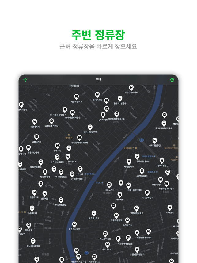 '대전교통'은 대전인을 위한 대중교통 안내 앱입니다.터치 몇 번으로 간단하게 이용해 보세요.개선 및 문의 사항을 앱 내 [설정 > 문의하기]로 보내주세요.앱 개발에 큰 도움이 됩니다.[주요 기능]- 노선 및 정류장 검색- 버스의 위치 및 도착 정보 조회- 주변 정류장 찾기- 노선, 정류장, 버스 즐겨찾기- 즐겨찾기 위젯- 노선 및 정류장 안내음성 미리듣기[서비스 안내]- 사용자의 위치 정보는 앱 내에서만 사용되며, 절대 수집하지 않습니다.- 노선, 정류장, 버스의 실시간 위치 등 모든 정보는 공공데이터포털(https://www.data.go.kr/)로부터 가져옵니다.[서비스 접근 권한 안내]선택 접근 권한- 위치 정보: 주변 버스 정류장 조회- 선택 접근 권한은 동의하지 않아도 서비스 이용이 가능합니다.- 선택 접근 권한 미동의 시 서비스 일부 기능의 정상적인 이용이 어려울 수 있습니다.