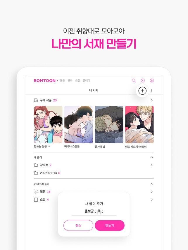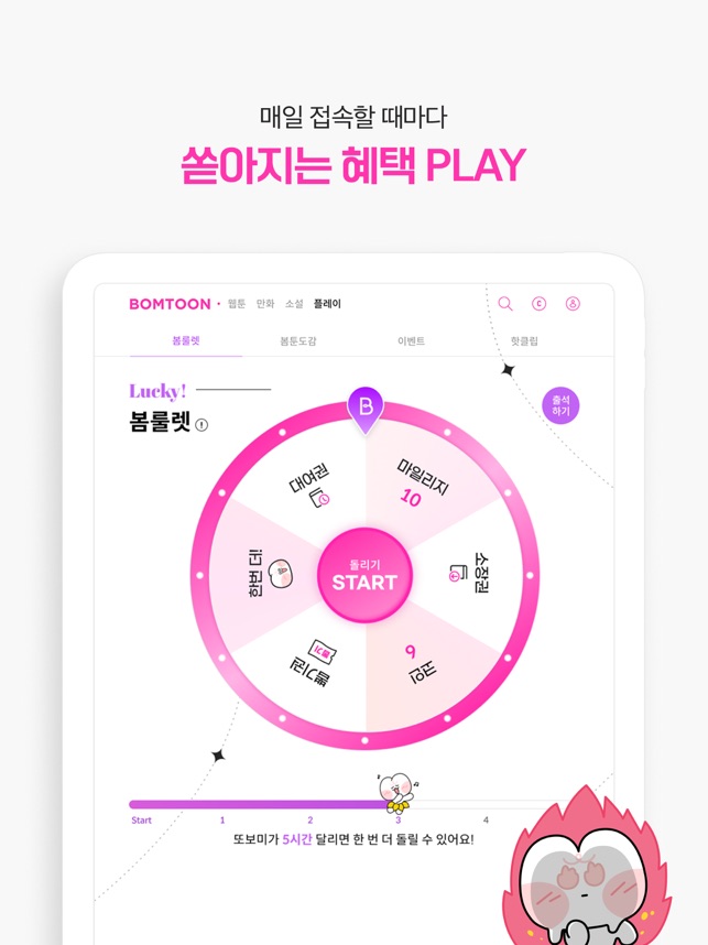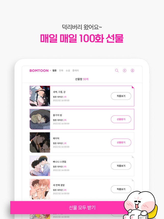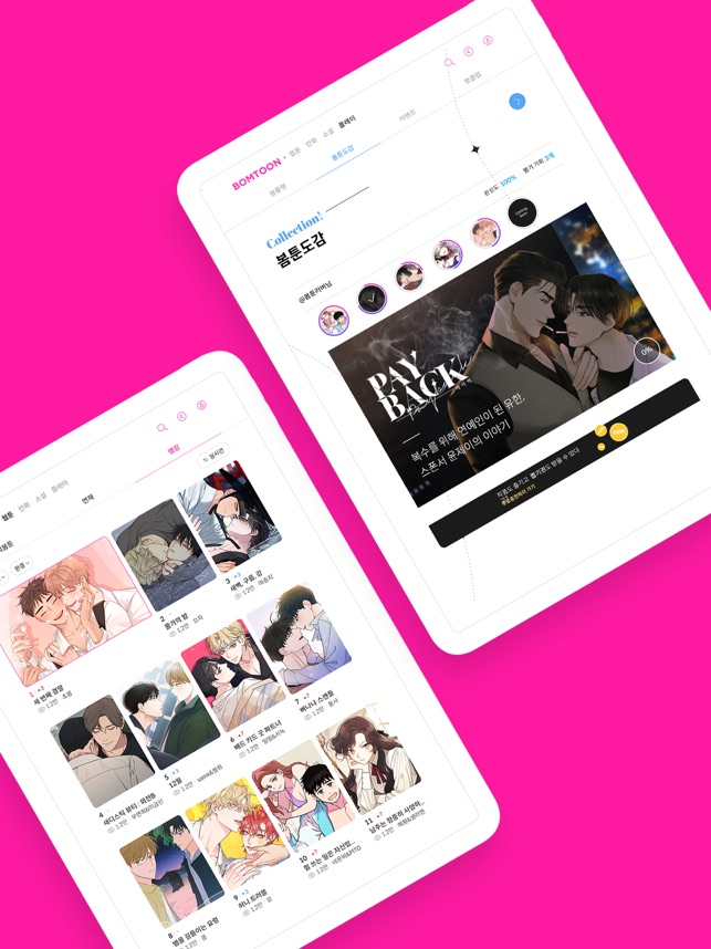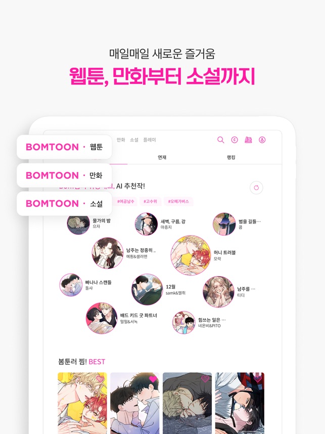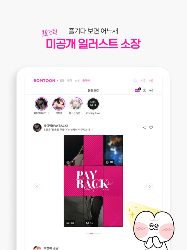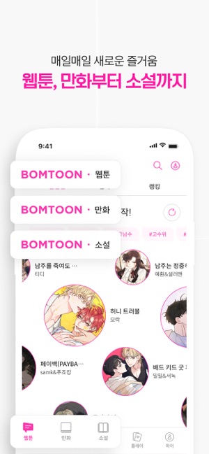작품부터 덕질까지 차원이 다른 웹툰생활, 봄툰입니다 :)웹툰을 편리하게 감상하고 봄툰만의 재미를 즐길 수 있도록 새롭게 리뉴얼되었습니다!! [ 오직 봄툰에서만 볼 수 있는 독점 웹툰 ]죽었던 연애세포도 되살리는 달달한 로맨스 웹툰, 지루한 일상 그 속의 잔잔한 일상의 재미를 알려주는 일상툰, 꿈과 환상 그리고 모험의 세계 간접체험 판타지 웹툰 등 웹툰팬이라면 꼭 보고싶은 명작들을 오직 봄툰에서만 공개합니다. [ 매일매일 쏟아지는 무료웹툰, 할인쿠폰 ]단 3초 회원가입만으로 즐길 수 있는 매일 100화 무료웹툰 선물, 첫결제 반값 등 다양한 혜택을 누려보세요! 【 리뉴얼 】[ 매일 즐기고 선물 받는 PLAY 공간 ]출석체크만 해도 참여 가능한 룰렛으로 매일 다양한 상품 받고, 즐길수록 커지는 다양한 혜택 받아보세요! [ 봄툰단독, 비공개 일러스트 수집하는 봄툰도감 ]봄툰 즐기기만 해도 주는 뽑기권으로 내 최애를 뽑아 가져보세요! 어느새 온·오프라인 굿즈가 내 품으로~ [ 취향에 따라 다 즐기는 웹툰/만화/소설 ]웹툰/만화/소설 각 홈에서 신작/할인, 추천작, 랭킹 등 다양한 작품을 만나보세요! [ 영구 보관된 내 작품으로 마음대로 꾸미는 내 서재 ]장르별, 취향별 등 마음에 드는 작품만 골라 폴더를 만들어 내 서재를 관리해 보세요! [ 나만의 맞춤형 뷰어 ]색상, 책갈피, 메모를 내맘대로 작성하고 나에게 맞는 뷰어로 설정하여 최적의 환경으로 작품을 감상해 보세요!* 봄툰 앱에서 사용하는 접근권한 안내[선택 접근 권한]알림 : 할인정보 및 이벤트에 대한 정보를 받을 시 필요카메라/사진 : 프로필 꾸미기, 고객센터 이용 시 필요추적허용 : 무료충전 광고 혜택 이용 시 필요