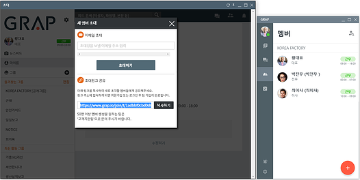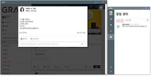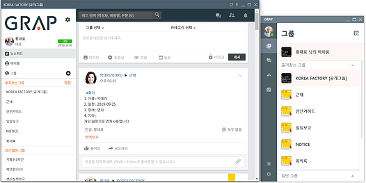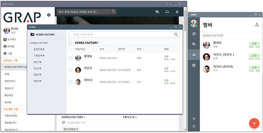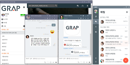 GRAP은 메신저 + 소셜네트워크 서비스가 합쳐진 업무 소통 시스템입니다. 카카오톡 및 밴드와 유사한 UI를 제공하며 간편하게 고객사별 UI 커스텀 기능을 제공합니다.
