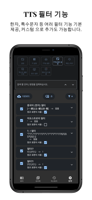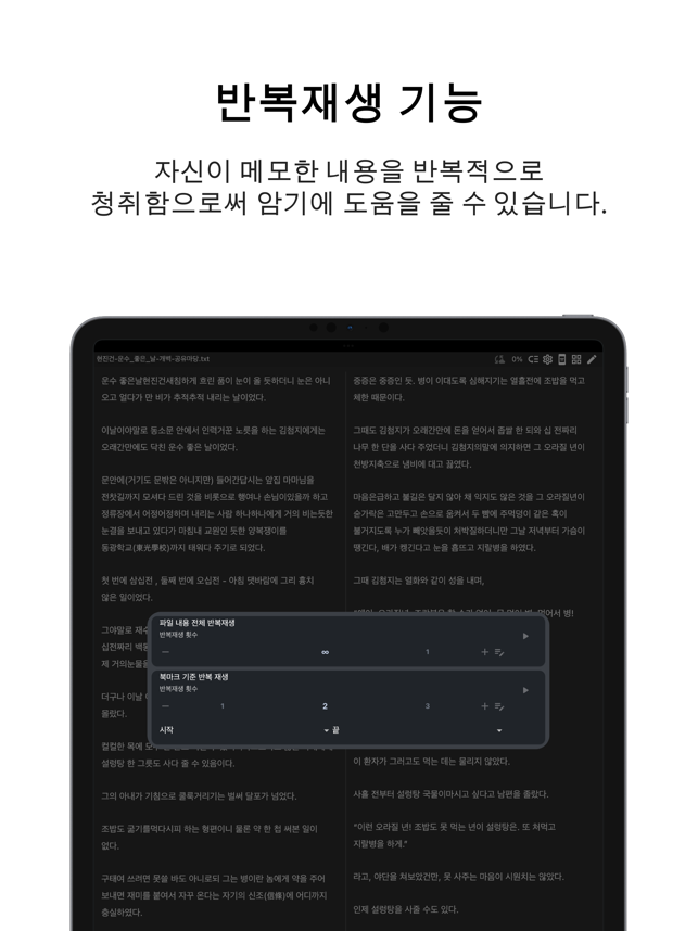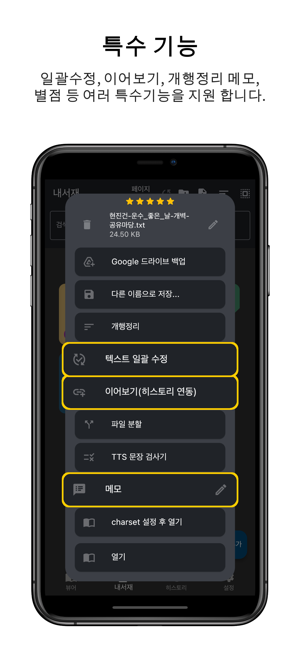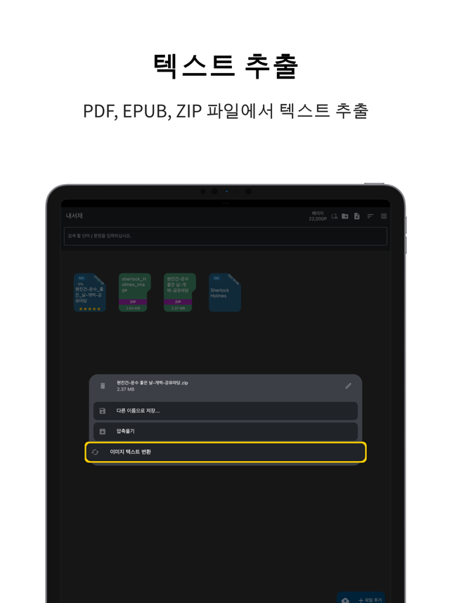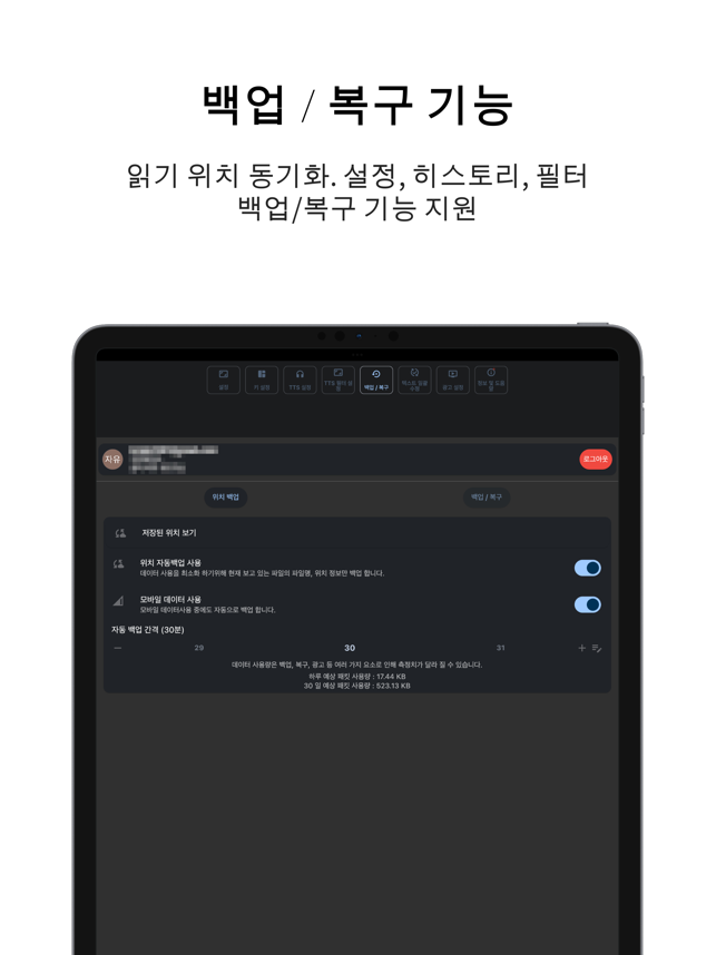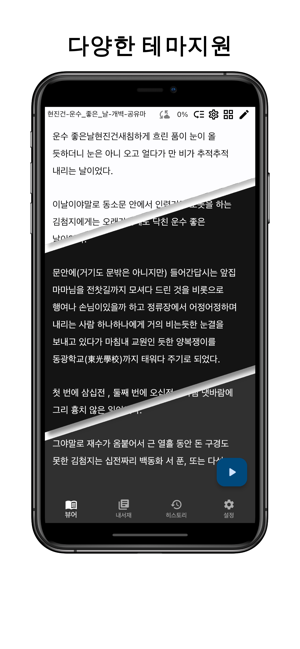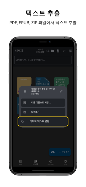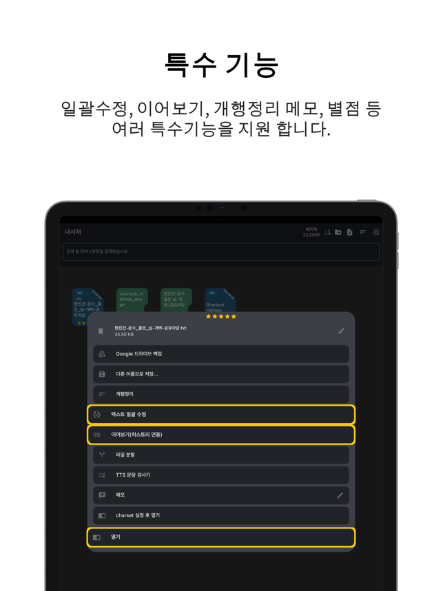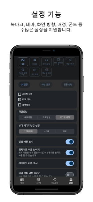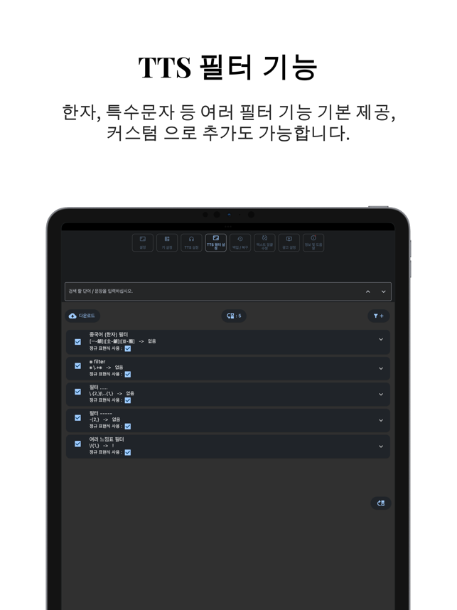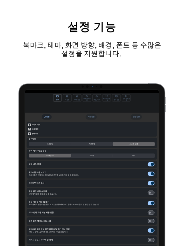TTS 에 최적화 된 텍스트/이미지 뷰어 어플입니다. 다양한 모바일 기기에서 사용가능하며 기기간 이어보기가 가능합니다. 이미지, epub, PDF 문서 파일을 텍스트 문서로 변경하는 기능이 내장되어 있습니다.tts 필터 기능 을 지원 합니다. 특수문자 와 듣기 싫은 내용을 변경하거나 제거 할 수 있습니다. 범용적으로 사용되는 필터는 기본으로 지원합니다. 디테일한 TTS 설정 을 지원 합니다. TTS 속도는 5배속 까지 지원하며, 한번에 한줄씩 읽는 것이 아니라 1~10 줄 씩 읽을 수 있도록 설정 할수 있습니다.드라이브연동을 통해 다양한 디바이스에서 읽는 위치를 동기화 할 수 있습니다. 지원 기능 : TTS 관련 - 백그라운드 TTS 재생 - TTS 필터 기능 (일반 사용자도 쉽게 쓸 수 있게 수십가지 기본 필터 제공) - TTS 구간 반복 기능 - TTS 타이머 기능 - 한번에 여러줄 읽기 기능 - 전화 통화시 TTS 정지 기능 - TTS 재생중도 스크롤 하여 앞뒤 내용를 볼 수 있는 기능. 텍스트 - 텍스트 편집 - 텍스트 일괄 편집 - 여러 텍스트 파일 을 하나로 합치는 기능. - 개행이 이상하게 된 파일을 위한 개행정리 기능 - OCR (이미지 텍스트 추출) - 실시간 OCR (카메라를 이용해 실시간으로 텍트스 추출) - OCR 처리 이후 일괄 편집이 용이하게 수십가지 일괄 편집 패턴 재공. - EPUB 텍스트 추출 - PDF 텍스트 추출 - EPUB 이미지로 변환 - PDF 이미지로 변환 UI 기능 - 라이트, 다크 테마, 블랙 테마 지원 - 108 가지 한국 무료 폰트 - 799 가지 해외 무료 폰트 - 65 가지 배경 이미지 - 스크롤 속도 기능 (조금만 스크롤 해도 스크롤을 많이 되게 하여 손가락의 피로도를 감소 시켰습니다) - 글자 크기, 색상, 자간 등 여러 설정 기능 - 하이라이트 , 북마크 표시 색상 설정 기능. - 여백 설정 기능 - 화면 방향 설정 기능 - 두페이지 보기 기능 (패드)특수 기능 -