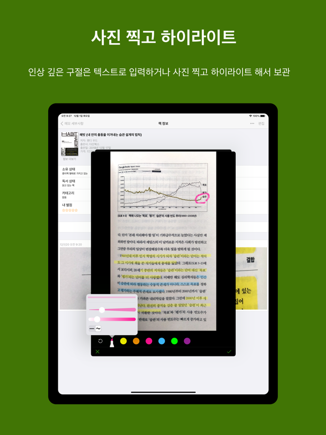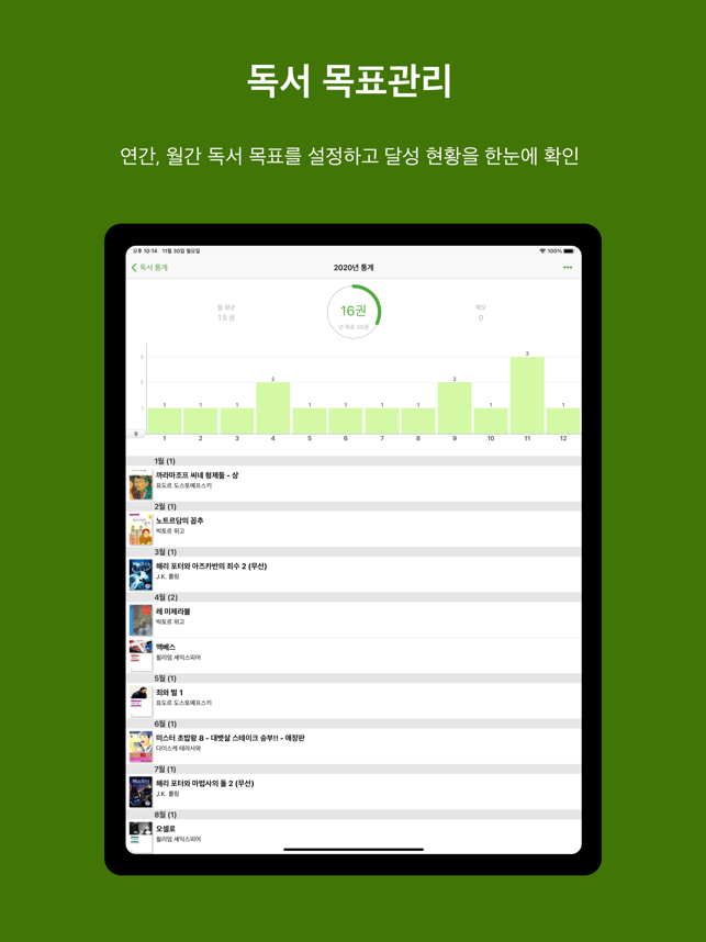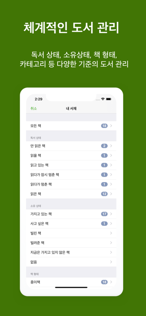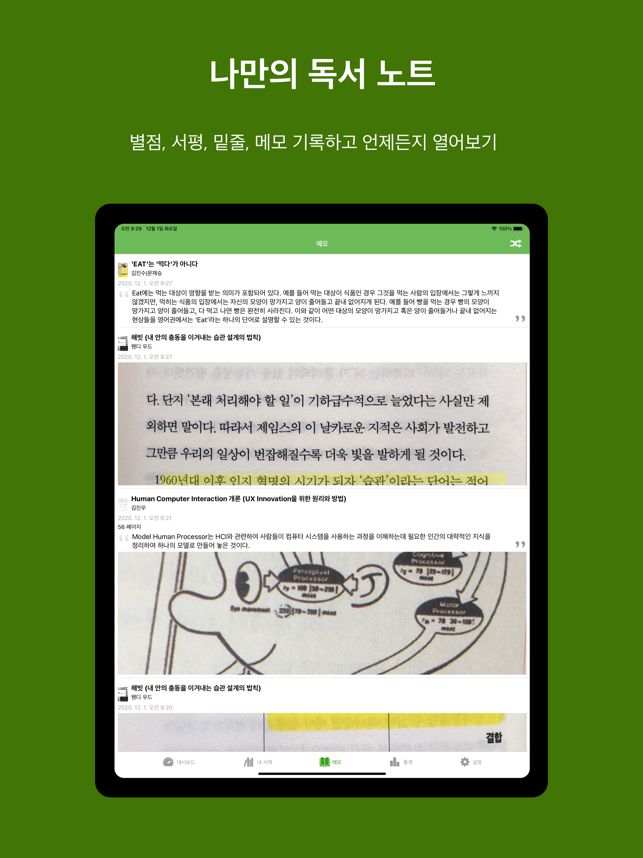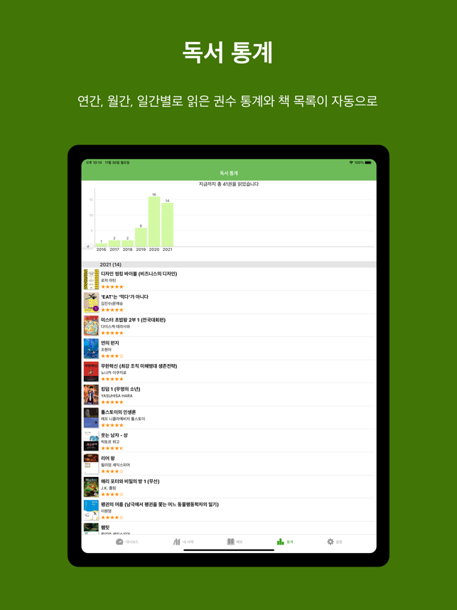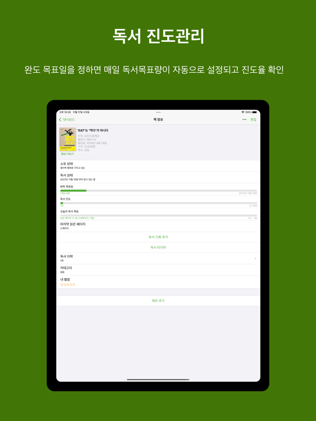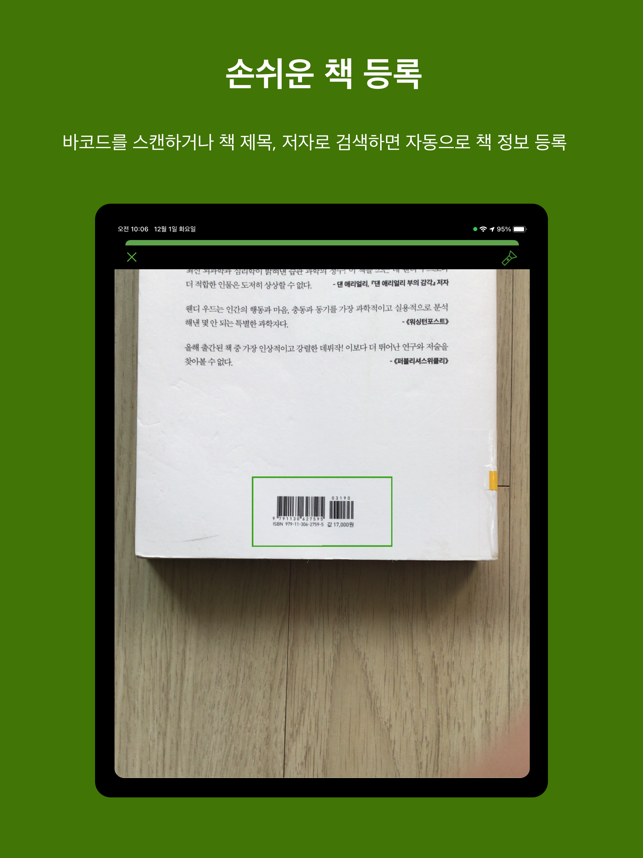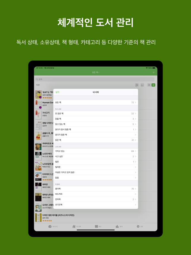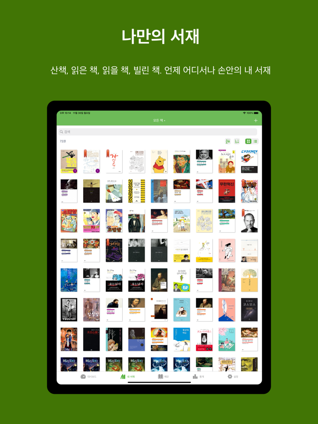 북트리는 편리한 독서 생활을 위해 책관리, 독서기록 및 독서노트를 할 수 있게 도와줍니다. 한번 구입해 iPhone과 iPad, M칩 맥에서 사용할 수 있는 유니버설앱입니다. ◉ 지속적인 앱 업데이트 2012년 출시한 이후 13년째 꾸준히 사용자 의견을 반영하고 있습니다. ◉ 이럴 때 사용하면 더 좋습니다• 언제든지 확인할 수 있는 손안의 내 서재를 꾸미고 싶을 때• 독서 후 독서기록을 남기고 싶을 때 • 나만의 독서노트를 기록하고 싶을 때 • 가지고 있는 책의 형태(종이, 이북, 오디오북등)와 카테고리별로 관리하고 싶을 때 • 사고 싶거나 읽고 싶은 책을 저장해 놓고 싶을 때• 독서 상태, 소유 상태, 책 형태, 카테고리 등 책을 여러 가지 분류로 관리하고 싶을 때 • 읽은 책의 통계와 목록을 관리하고 싶을 때 • 가지고 있거나 빌려서 읽건 간에 나만의 책 목록을 관리하고 싶을 때 • 독후감을 책 정보와 같이 기록하고 싶을 때 • 책을 읽으면서 밑줄이나 메모를 기록하고, 모든 밑줄이나 메모 내용을 항상 보고 싶을 때• 종이책과 전자책 상관없이 내 모든 메모를 한 곳에서 기록하고 관리하고 싶을 때 • 월간 또는 연간 독서 목표를 두고 달성을 기록하면서 독서하고 싶을 때 • 읽은 책을 독서캘린더로 만들면서 독서 동기 부여를 하고 싶을 때 • 책 커버 또는 독서 노트를 블로그나 인스타그램 등에 공유하고 싶을 때 ◉ 나만의 도서 관리 소장한 책이나 읽은 책 등 내 손안에 나만의 서재를 꾸밀 수 있습니다진짜 내 서재 같은 책장 목록을 가질 수 있습니다. • 책 목록 형태: 책장, 목록 독서 상태, 소유상태, 책 형태, 카테고리 등의 다양한 기준으로 책을 관리할 수 있습니다. • 독서 상태: 안 읽은 책, 읽을 책, 읽고 있는 책, 읽다가 잠시 멈춘 책, 읽다가 멈춘 책, 읽은 책 • 소유 상태: 가지고 있는 책, 사고 싶은 책, 빌린 책, 빌려준 책, 지금은 가지고 있지 않은 책 • 책 형태: 종이책, 하드커버, 전자책, 오디오북, 기타 • 카테고리: 사용자가 직