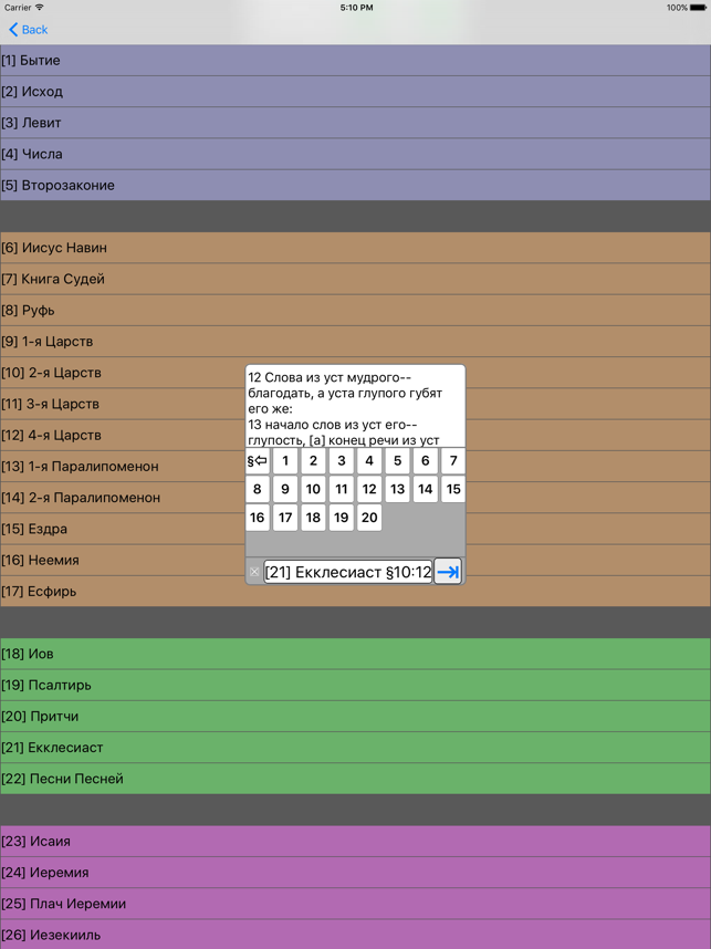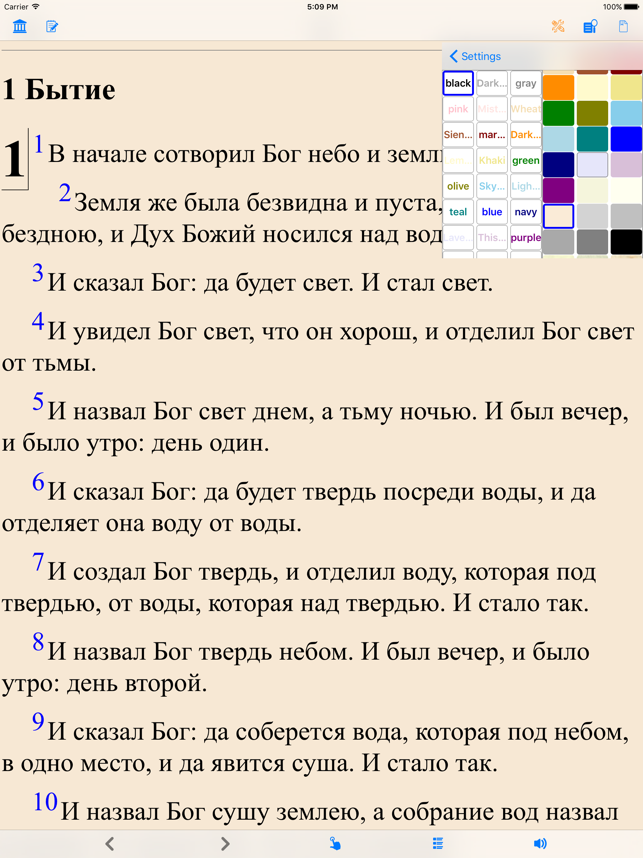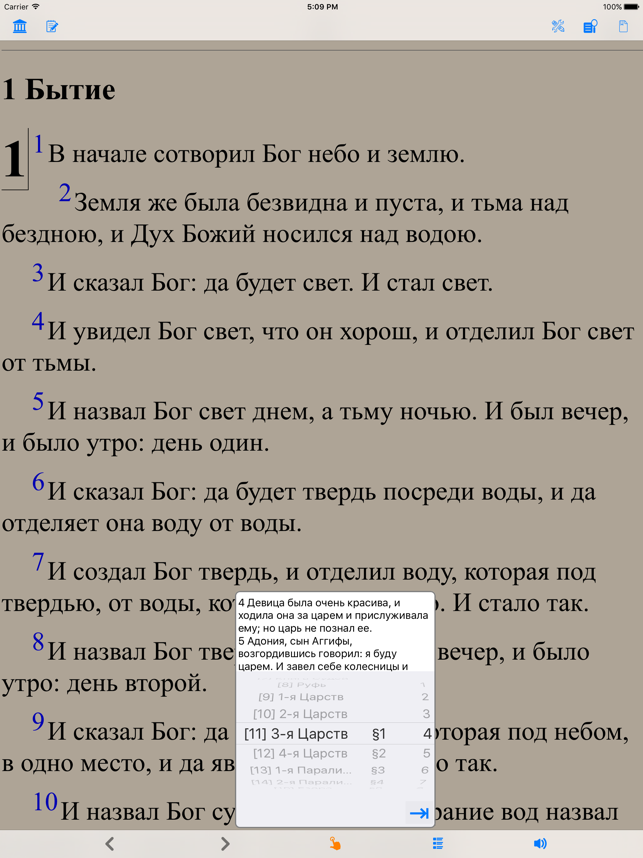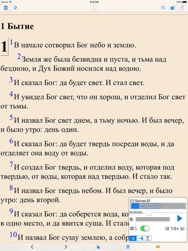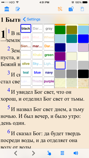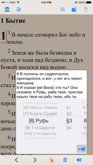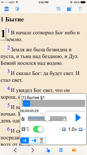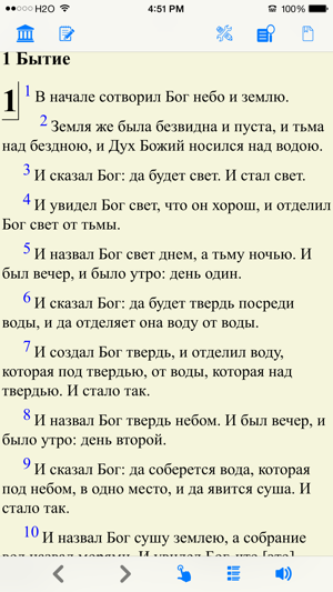 Библия (текст и аудио)(Russian Bible). Both bible text and audio are in russian. читать и слушать Библию. Please check the application web site for video introduction of the application. The reader application provides the following important customer benefits: * True full screen reading mode * Real time font/font size and color/texture previews allow you to select fonts and colors and see in real time what pages would look like – Support all iPhone's available fonts – Support different font size – Support 70+ font color /background color/texture * Continuous reading experience (One tap for page down/up; Left/right swipe to next/previous chapter/story) * Portrait and landscape reading mode (support all 4 orientations) * Remembers the last reading location (exact book, chapter and scroll position) * Quick scrolling navigation between chapters/stories to provide an overview of the entire book * Quick reference feature and web brow