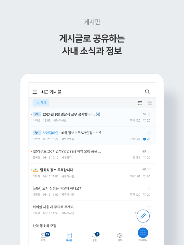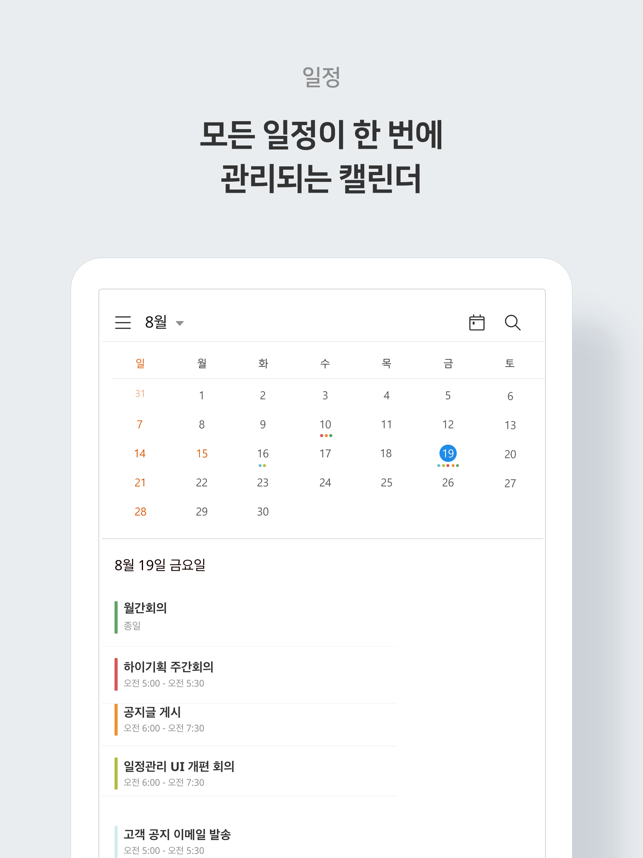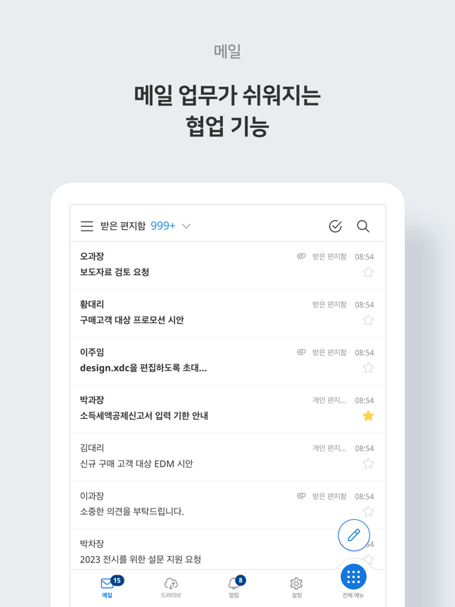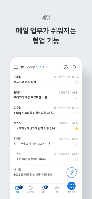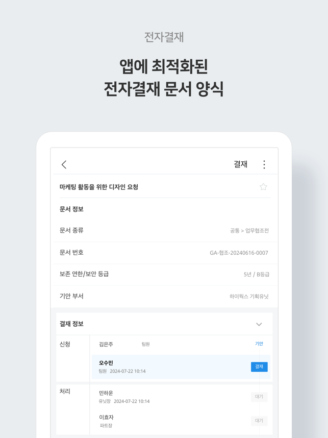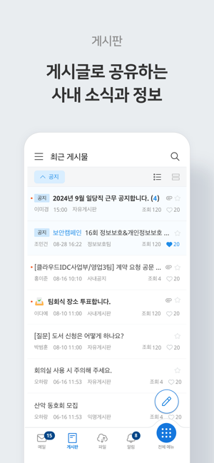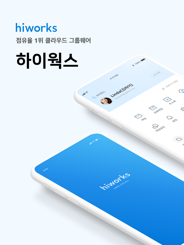 그룹웨어 시장점유율 1위 하이웍스, 업무에 필요한 모든 기능이 한 곳에!기업메일, 전자결재, 근무관리, 일정관리 캘린더 등 다양한 기능을 활용해 보세요.[주요 기능]· 메일: 암호메일, 승인메일, 멀티메일, 그룹메일 등 협업과 정보 보안에 특화된 메일을 사용해 보세요.· 공용메일: 팀으로 온 업무 메일을 동료와 함께 관리해 보세요. 공용메일을 사용하면 내·외부 협업 시 생기는 소통의 혼선을 방지할 수 있어요.· 전자결재: 앱에 최적화된 문서 양식이 20가지 이상 제공돼요. 언제든 문서를 기안하고 결재하세요.· 근무: 출퇴근을 GPS 기반으로 정확하게 체크해 보세요. 휴가 및 근무계획 신청이 간편하고 근무현황을 볼 수 있어요.‘휴가신청’을 클릭하면 전자결재를 통해 휴가를 신청할 수 있어요.· 일정: 공유 캘린더에 일정을 등록하세요. 동료와 실시간으로 업무 진행 일정을 확인할 수 있어요.· 주소록: 고객사 혹은 협력사 담당자의 연락처를 공유 주소록에 등록해 보세요. 주소록에 태그를 설정하면 연락처를 체계적으로 관리할 수 있어요.· 드라이브: 공용자료를 드라이브에 올린 후, 비밀번호를 설정하여 안전하게 파일을 공유하세요.· 게시판: 전사 게시판, 익명 게시판, 팀별 게시판 등 원하는 게시판을 생성해 보세요.· 알림: 새로운 메일을 받거나, 사내 게시판 내 새소식이 올라오는 등 하이웍스 내 업데이트 정보를 알림으로 확인하세요.[접근 권한 안내]ㆍ필수 접근 권한-기기 정보: 서비스 최적화 및 오류 확인 등을 확인해 사용성 개선에 반영하고자 권한을 요구합니다.ㆍ선택적 접근 권한-카메라: 사진을 촬영해 공유하는 경우 권한을 요구합니다.-저장공간: 사진 또는 파일 등을 기기에 저장하거나 선택해 공유할 수 있도록 권한을 요구합니다.* 선택적 접근 권한은 동의하지 않아도 해당 기능을 제외한 서비스를 이용할 수 있습니다. 단말기의 접근 권한 승인 철회를 통해 추후 승인 또는 거부를 재설정할 수 있습니다.[하이웍스 고객센터]매뉴얼 www.hiworks.com/manual#/h