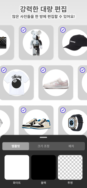 Now you can remove any unwanted objects with a swipe of your finger using Magic Retouch. Editing perfect product shots is a breeze (and dare we say, fun!)**Apple 선정 우리가 사랑하는 앱**단 몇 번 탭하여 완벽한 제품 사진을 쉽게 생성, 편집, 구성하세요. 제품을 3배 더 빨리 등록하고 더 많이 판매하기 위해 수많은 크리에이터와 온라인 셀러가 Photoroom을 선택하는 이유가 바로 이것입니다.이 모바일 앱 내에서 다음과 같은 일을 모두 할 수 있습니다.- Depop, Poshmark, Amazon, Shopify와 같은 전자상거래 마켓플레이스에서 사용할 전문적인 제품 이미지를 생성합니다.- Instagram, Facebook, Youtube, Pinterest 등에 맞춘 기본 제공 템플릿을 사용하여 마케팅 자료를 생성합니다.- 웹 페이지와 SNS 프로필에 사용할 프로필 사진을 사용자 지정합니다.- 사용자의 상점, 인생, 사용자 자체를 소개할 잘 다듬어진 이야기를 큐레이팅합니다.- 사진을 보고 다운로드하고 추가하도록 누구든 초대합니다.- 더 많이 더 빨리 홍보합니다.Photoroom의 여러 기능을 탐색하고 어떻게 이미지 품질 저하 없이 사진을 원활히 편집할 수 있는지 알아보세요.- 배경 제거 도구로 사진을 쉽고 정확하게 편집합니다.- 일괄 편집기로 한 번에 수십장의 사진을 편집하여 시간이 절약됩니다.- 자르기 보조 기능의 도움을 받아 가장자리를 정확하게 다듬습니다.- 매직 리터치 기능을 사용하여 즉시 원치 않는 개체와 흠을 제거합니다.- 매직 크기 조정 기능으로 SNS나 판매 플랫폼으로 사진을 손쉽게 내보낼 수 있습니다.- 스마트 템플릿 기능으로 요구사항에 가장 적합한 추천 템플릿을 획득합니다.- 즉석 가상 배경 기능은 AI를 사용하여 제품 사진에 사용할 멋진 배경을 즉석으로 생성할 수 있습니다.Terms of Use: https:/