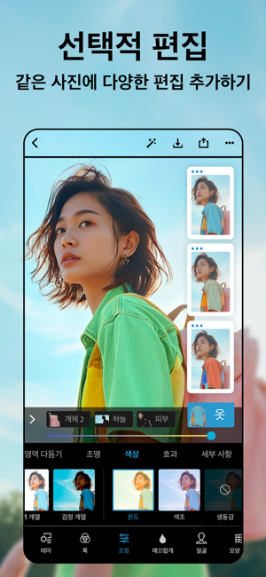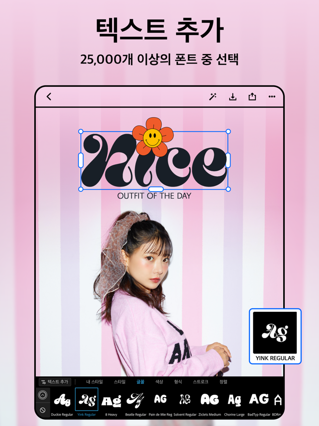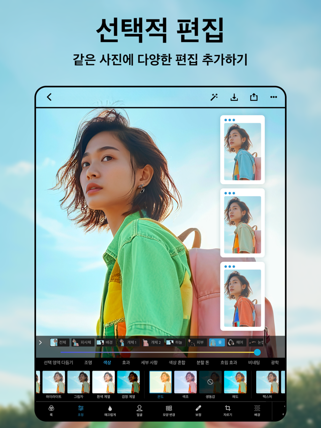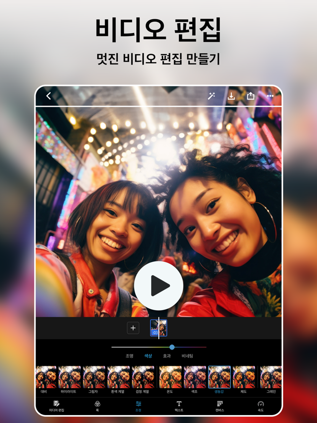 비율 조정: 특정 개체의 모양을 변경하거나 크기를 조절해 보세요!지저분한 부분을 보정하세요. 이제 편집기에 얼룩 제거, 잡티 보정, 방해 요소 삭제를 위한 보정 도구를 사용할 수 있습니다!생성형 확장: 이제 정확히 원하는 비율의 사진을 만들 수 있습니다. 모든 타임라인이나 덤프, 프로젝트에 완벽하게 알맞은 사진을 만들어 보세요. 현재 이 기능은 iPhone에서만 지원됩니다. 애니메이션 스티커: 수백만 개의 애니메이션 스티커 중에서 선택하여 편집에 생동감을 더해 보세요! 블러시: 설레지 않나요? 메이크업 가방에 새롭게 추가된 13가