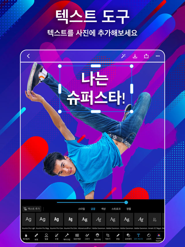 모두를 위한 재미있고 쉬운 사진 편집재미있고 빠르고 쉬운 사진 및 비디오 편집기인 Photoshop Express 와 함께 이동 중에도 창의력을 발휘해보세요. 수백만 명의 창의적인 사람들이 사용하는 원활한 원터치 사진 변환과 간단한 비디오 편집을 살펴보세요. 강력한 AI 사진 및 비디오 디자인 도구를 활용하여 Photoshop Express로 사진을 수정하고 고품질 비디오를 만들 수 있습니다.Photoshop Express와 함께 손끝에서 이루어지는 광범위하고 다양한 기능과 미학을 경험하세요. 눈에 띄는 사진 콜라주 이미지를 만들고, 공유할 가치가 있는 순간을 수정하고 강화하여 멋진 소셜 콘텐츠를 만들어 보세요. 나만의 AI 사진 생성기를 사용하면 한번의 탭으로 사진을 만들 수 있습니다. Photoshop Express Premium으로 무한한 가능성을 열어보세요!PHOTOSHOP EXPRESS 기능AI 사진 생성기- 시선을 사로잡는 맞춤형 스티커 만들기- 텍스트 프롬프트로 만든 의상이나 액세서리를 시도해보세요- 설명을 통해 생성된 독특한 이미지로 비전과 무드보드를 업그레이드하세요비디오 편집기 (iPad에서 비디오 사용 불가)- 휴대폰에서 바로 고해상도 비디오 내보내기를 위한 클립 다듬기, 속도 조정, 색상 변경, 크기 조정 및 회전- 카메라 롤에서 여러 비디오를 추가하여 하나의 비디오로 결합- 편집에 딱 맞는 분위기를 위해 수천 개의 음악 트랙에 액세스하세요AI 포토 인핸서- 다양한 사진 편집 도구 및 프리셋 중에서 선택- 적목 현상 보정, 디헤이징, 미적 필터 적용- 사진 크기를 자르고 비뚤어지거나 왜곡된 카메라 각도 수정- 몇 번의 간단한 스와이프로 배경 노이즈를 제거하고 결함을 부드럽게 처리합니다- 한번의 탭으로 사진을 수정하고, 인물 사진과 셀카를 몇 초 만에 수정하세요- 즉시 사용 가능한 그리드 레이아웃으로 놀라운 사진 콜라주 만들기개인화된 이미지 디자인- 다양한 글꼴과 레이아웃으로 사진에 텍스트를 추가하세요- 이미지 편집기를 사용하여 나만의 방식으
