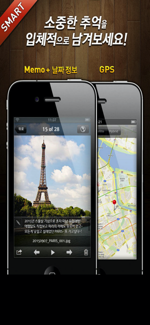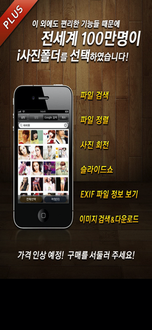 ▶ 일본 App Store Rewind 2011 전체 1위 ▶ 한국 App Store Rewind 2011 전체 3위 ▶ 한국 iTunes Rewind 2010 전체 3위 ▶ 일본 iTunes Rewind 2010 전체 8위 ▶ 30초에 1개씩 판매 되는 사진관리 앱! ▶ 일본, 중국 [금주의 아이폰앱] 선정 ▶ 한국, 일본, 중국, 태국 전체 1위 ▶ 24개국 사진 카테고리 1위 보안은 더 강력하게,화면은 더 아름답게, 사용은 더 편리하게! 아이폰에 저장된 수백 장의 사진/동영상, 이제 [i사진폴더]로 편리하게 관리하세요! ◆ 기능√ 사진/동영상을 폴더별로 체계적으로 저장 관리- 폴더 안에 하위 폴더 추가 및 편집- 카메라롤 추가로 바로 확인 및 관리√ 강력한 사생활 보호 기능- 완벽 보안! 소중한 사진을 지키는 가장 안전한 앱- 앱 시작시 암호, 폴더별 암호, 전송/백업 잠금 지원- 비밀폴더만 숨기는 고스트 비밀번호 지원 ※ 고스트 비밀번호는?- 기존 비번 입력시 : 모든 폴더 보임(비밀폴더 포함)- 고스트 비번 입력시 : 일반 폴더만 보임(비밀폴더 X)※ 고스트 비밀번호 활용법친구들이 사진 보여달라고 하면 고스트 비번 입력!보여주기 싫은 비밀폴더를 감쪽 같이 숨기세요.√ 편리한 가져오기- 카메라롤 사진을 [전체선택]하여 한번에 가져오기- 가져오기시 선택한 파일이 표시되어 중복 방지√ 원본과 똑같은 사진- 가져오기로 저장되는 사진은 원본과 완전 동일√ 다양한 디자인 테마- 총 4가지 디자인 테마 지원- 폴더 색상 및 표지사진 변경으로 개성 연출 가능[회전] 시계/반시계 방향, 좌우 반전[메모] 개별 사진에 메모 쓰기/편집 가능[검색] 원하는 사진을 빠르게 찾을 수 있음[공유] 트위터, 페이스북, 카카오톡, Dropbox 등[GPS] 사진의 위치정보를 지도에서 한번에 보여주기[EXIF] 전문가를 위한 EXIF 정보 표시(셔터 스피드 등)[백업] WiFi/ iTunes 파일 공유로 멀티 업/다운로드[전송] WiFi/ 블루투스로 다른 아이폰/패드에 파일 전송[다