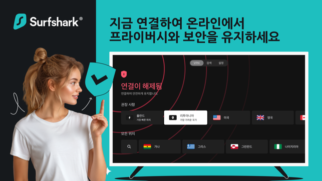 잠깐! 온라인에서 보안은 유지하면서 끊김없고, 안전한 인터넷 서핑, 한번쯤은 고민해보셨죠? 서프샤크를 이용하면 이 모든 것이 가능해요! 100개국 이상에 보유한 서버가 최대 10Gbps의 속도를 지원하여 빠른 연결을 제공하고 지금 7일동안 무료로 사용해볼 수 있으니 경험해보세요!서프샤크는 사용하기 쉽고 여러가지 서비스들을 이용할 수 있습니다!▸ 하나의 계정으로 여러기기에 연결 가능구독 하나로 모든 기기에서 Surfshark를 이용할 수 있습니다. 여러분의 아이폰은 물론, 아이패드, 맥과 같은 모든 디바이스들을 보호하세요!▸ Alternative ID로 새로운 온라인 신원 생성새로운 온라인 프로필 생성: 이메일 주소와 이름 등을 변경할 수 있습니다. 웹사이트에 가입하거나 뉴스레터를 구독할 때 실제 신원을 철저히 숨기세요.▸ 안전한 콘텐츠 액세스VPN을 이용하여 즐겨보는 프로그램과 소셜 미디어에 안전하게 액세스하세요. 방대한 서버에서 선택할 수 있기에 고속 연결을 유지하기 위해 보안을 포기할 필요가 없습니다.▸ 온라인 감시자 차단공공 와이파이를 사용할 때 해커가 사용자 데이터를 수집할 수 있습니다. 엔드투엔드 암호화를 통해 사용자 데이터는 비공개로 유지됩니다. Surfshark를 이용하면 손쉽게 온라인 발자국을 숨길 수 있습니다.▸ 개인 데이터는 개인의 소유Surfshark에 연결하는 동안 무엇을 하시나요? 아무도 알 수 없습니다. 당사는 사용자가 행하는 온라인 활동을 모니터링, 추적 또는 저장하지 않습니다. 무엇을 하든 개인 데이터는 본인만 알 수 있습니다.▸ 속도? 전혀 문제없습니다최대 10Gbps 속도를 제공하는 Surfshark 서버를 사용하면 추가 버퍼링이나 보안 위협 없이 즐겨 찾는 웹사이트를 탐색하거나 영화를 감상할 수 있습니다.▸ 서프샤크 다운로드 — 로그인 — Auto-connect서프샤크 사용은 이렇게나 간단합니다. 로그인하고 필요한 국가 서버를 선택하면 몇 초 내로 서버에 연결됩니다. 아, 그리고 Auto-connect 기능을 사용하면 VPN에