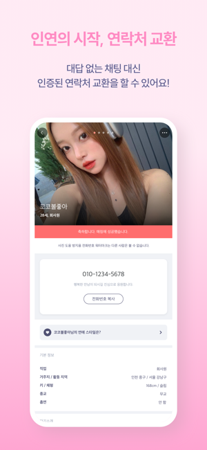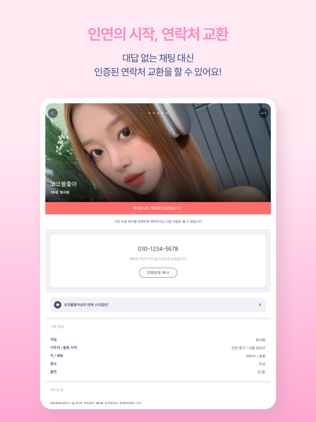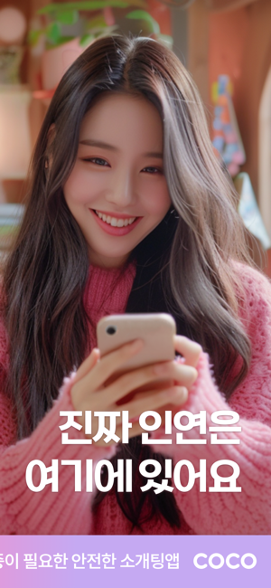 고객이 신뢰하는 브랜드 대상 (Trust Brand Awards)6년 연속 1위 수상 (한경비즈니스 주최)지금까지 진정한 소개팅을 제공하는 앱을 찾으신 적이 있나요?진실된 인연을 연결해주는 것이야말로 '진짜 소개팅' 아닐까요?코코는 다양한 소개팅 앱에서 느낀 갈증을 시원하게 해결해 드릴 거예요!쉽게 연결되고 가볍게 만나는 인스턴트 같은 소개팅 앱과는 다르게, 코코는 '진짜 소개팅'을 주선해 드립니다.- 매일 오전 11시, '진짜 소개팅'코코는 매일 오전 11시마다 진정성 있는 '진짜 소개팅'을 선사합니다. 다른 앱들과 달리 "아무나"를 대상으로 한 모호한 소개가 아닌, 회원님의 연애 스타일, 취미, 취향 등을 고려한 최적화된 매칭 알고리즘으로 높은 연결 가능성을 자랑합니다. 우리와 함께 멋진 인연을 만들어보세요!- 필터 한 번으로 이상형 소개오늘의 추천 리스트에서 마음에 드는 이성을 찾지 못하셨다면 걱정하지 마세요. 간편한 필터 기능을 사용하여 원하는 조건과 성격, 외모 등을 기준으로 원하는 이상형의 프로필만 골라 추천받으실 수 있습니다. 나에게 딱 맞는 이성과 만남의 기회를 잡아보세요.- 의미 없는 채팅보단 실제 연락처 교환코코는 실체 없는 대화창이 아닌 진정한 만남과 교류를 추구합니다. 회원님들이 서로를 확실히 알게 되면 실제 연락처 교환도 가능하도록 지원합니다. 응답하지 않거나 일치하지 않는 대화창이 아닌, 진정성 있는 대화를 나누며 관계를 발전시킬 수 있는 기회를 제공합니다.- 원치 않는 지인 차단 기능지인을 만나 당황하지 않도록 코코의 '지인 차단' 기능을 통해 원하지 않거나 보고 싶지 않은 사람들을 효과적으로 차단할 수 있습니다. 자유롭게 원하는 만남에 집중하세요.- 여성 중심의 맞춤형 소개팅코코는 여성 여러분을 위해 맞춤형 소개팅을 제공합니다. 우리의 매칭 알고리즘은 여성의 선호도를 최우선으로 고려하여 최적의 파트너를 추천합니다.- 13년 동안 축적된 전문성코