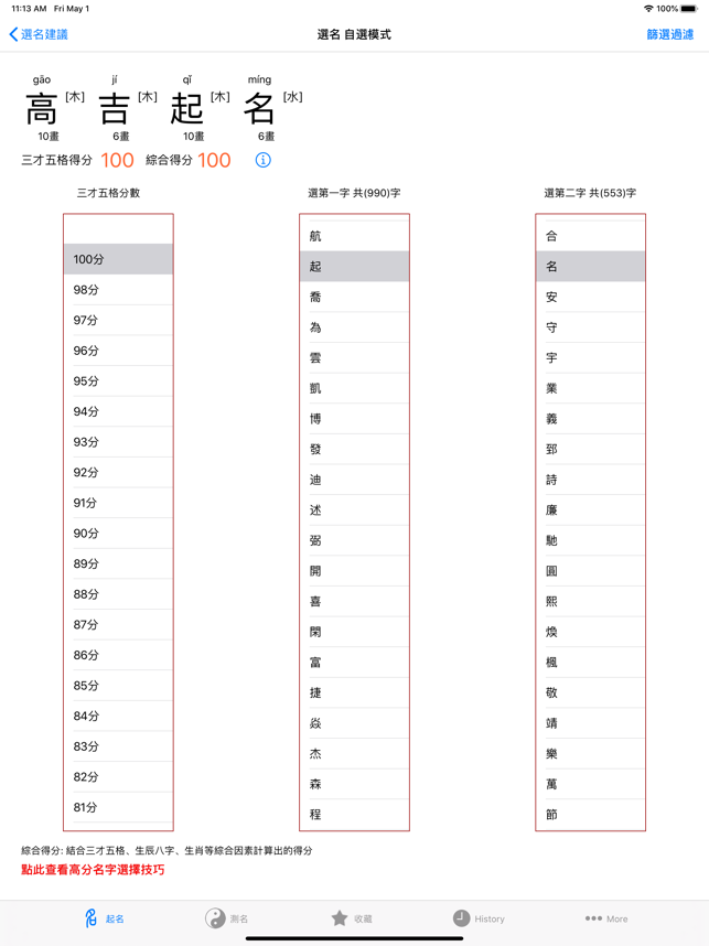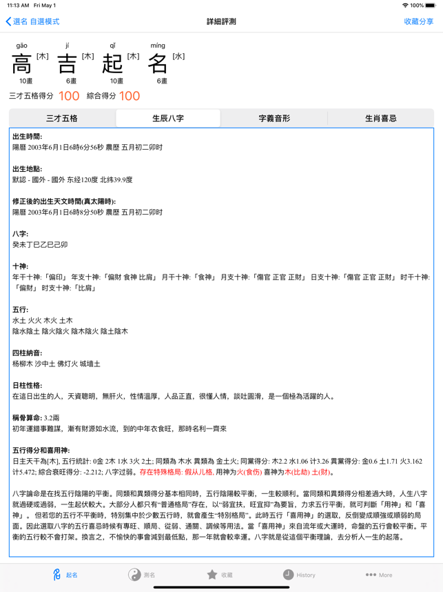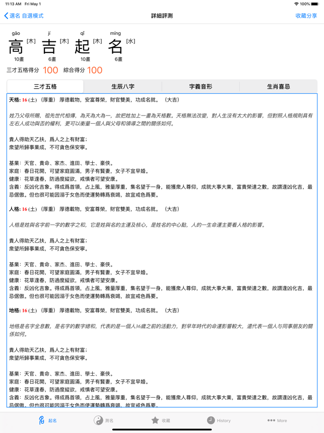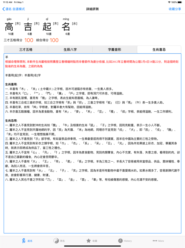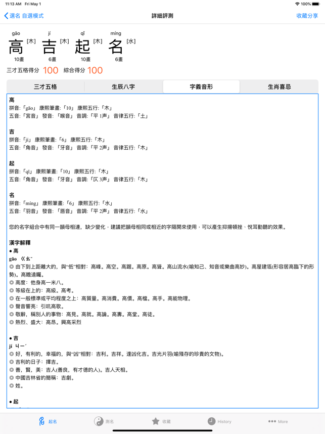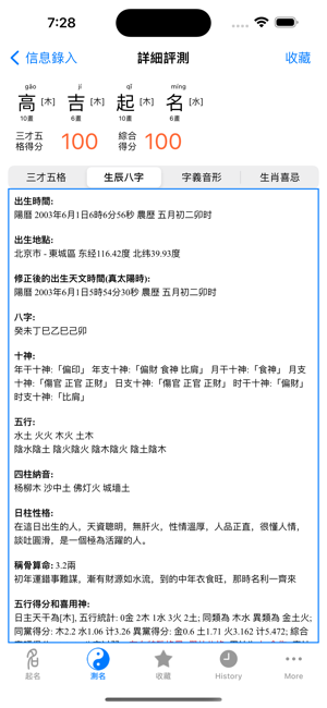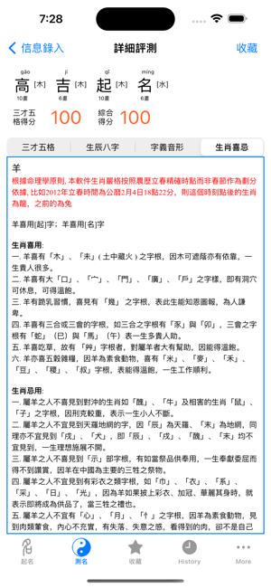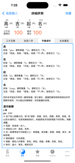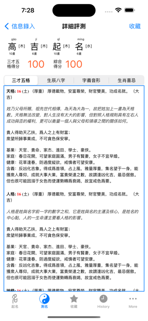 高吉起名是基于中國古代傳統周易理論、命理學及姓名學原理, 綜合生辰八字、三才五格數理、生肖喜忌、五音音律、字形、字意等因素開發而成的專業起名輔助軟件。高吉起名在八字、漢字音形意等方面的研究遙遙領先, 幷根據每個人的特點如生辰、性別、屬相等進行了起名推薦的專門優化。本軟件即可作爲起名軟件,也適合八字命理學研究愛好者以及姓名學理論研究愛好者作爲研 究工具使用。* 按照命理學原則, 本軟件年的分界點以農曆立春時刻點爲依據, 而不是以春節爲分隔點, 比如2012年立春時間爲公曆2月4日18點22分,則這個時刻點後的生肖爲龍,之前的爲兔, 八字中的年柱也以立春時點爲依據, 比如2012年2月4日18點22分之前爲辛卯年之後爲壬辰年, 月柱以農曆月的節氣具體時刻點爲劃分點,比如2012年驚蟄的時點爲3月5日12點21分,則該時點前的月柱爲壬寅月之後爲癸卯月。在進行八字測算時, 會根據出生地和出生時間等因素進行修正得到出生的真太陽時,以生辰的真太陽時爲八字測算的基準而非出生的鐘錶時間。特此說明。* 提供自助起名和系統智能推薦兩種起名模式,可以輕鬆取出即適合命理、又音形意俱佳的高分吉祥好名字!* 專業生辰八字、漢字音律、意義、字形等方面的研究, 判別結果精確無誤* 單姓、複姓,單名、雙名等起名, 全面支持大陸簡體及臺灣、香港、澳門等地區的繁體語言* 采用經過地理位置及時差因素計算出的真太陽時作爲推算八字基礎, 準確判斷八字格局, 除正格外、能判斷所有特殊格局如曲直格、炎上格、稼穡格、從兒格等等, 在正確判斷命局的基礎上選擇喜用神* 漢字筆劃及五行屬性以《康熙字典》爲標準,音律五行則參照五音姓名學相關規則制定(如商音屬金、羽音屬水等)* 針對不同性別進行了專門優化, 如女性起名過程中軟件會自動排除含有女性不宜使用的數理漢字, 男性起名也排除了僅適合女性用的漢字* 自選模式下, 提供完全的篩選功能, 可指定漢字五行屬性來匹配喜用神, 也可指定用字, 比如滿足家族族譜指定用字的需要, 也可排除你不喜歡的一些漢字, 同時提供生肖喜忌的用字選擇* 推薦模式下,一鍵輕鬆生成超多高分吉名!所有結果均可到各大測名網站進行驗證* 提供全面的測名功能,包括三才五格剖象詳細說明、生辰八字解讀、字意音形剖析、生肖喜忌說明等內容* 提供好名收藏功能, 起名過程發現好的名字需要後續比較, 簡單一鍵加入收藏夾,