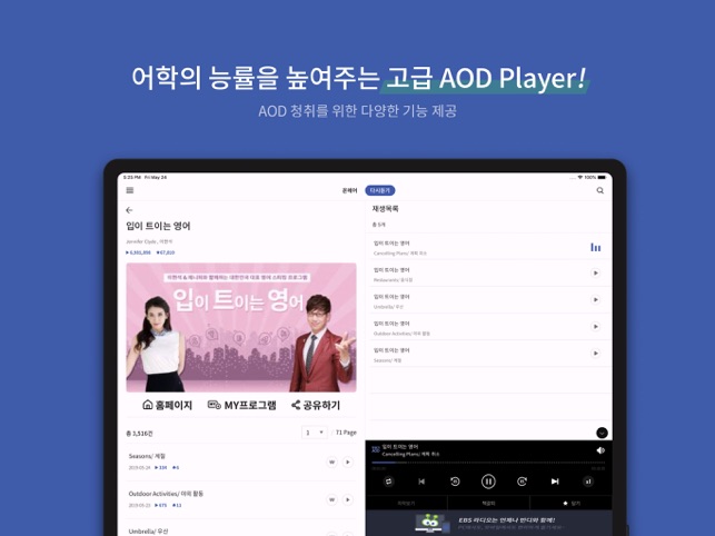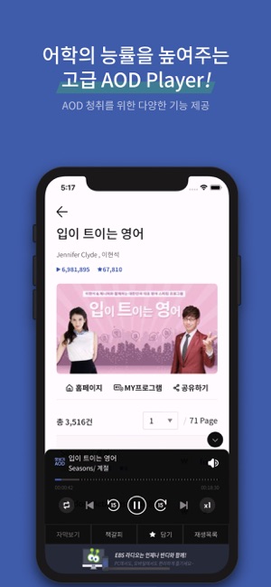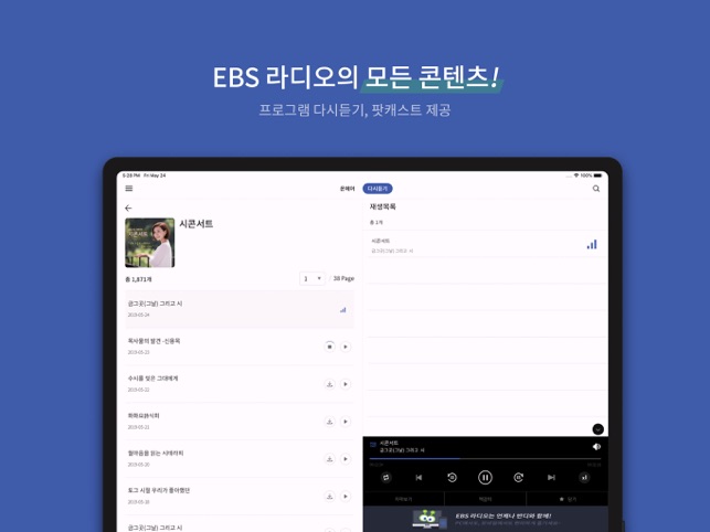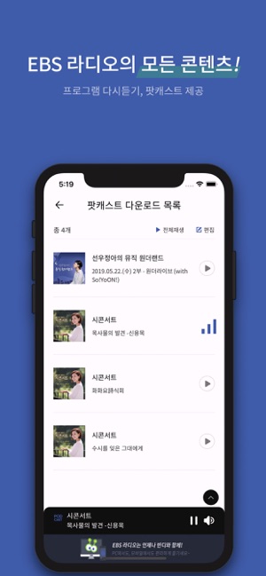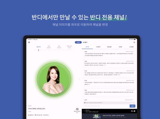 교육의 중심, EBS의 라디오 앱 반디로EBS FM/인터넷 라디오채널 실시간 온에어 서비스와세상의 모든 외국어 “오디오어학당”,편안하게 듣는 지식의 신세계 “오디오e지식” 등EBS만의 AOD 구독 서비스를 즐겨보세요! [주요 서비스]- EBS FM채널 실시간 청취 제공 - 인터넷 전용 라디오 채널 (반디 외국어 전문 채널) 실시간 청취 제공 - 청취 중인 방송 프로그램에 대한 다시듣기, 도서정보, 방송내용, 선곡표 제공 - 실시간 참여가 가능한 반디톡 제공 - EBS 구독 서비스 “오디오 어학당”, “오디오e지식”의 AOD 콘텐츠 다시듣기 제공 - 방송 편성표 제공 - push 알림, 잠금 화면 재생 지원 - 앱 설정 (네트워크, 자동실행, 자동종료, 앱 버전확인 등) [앱 접근 권한 안내]* 선택 접근 권한- 알림 권한 : 방송 시간 알림, 방송 및 부제 오픈 안내 등의 정보를 기기 알림으로 받기 위해 필요한 권한 ※ ‘선택 접근 권한’은 해당 기능을 사용할 때 허용이 필요하며, 비허용 시에도 해당 기능 외 서비스 이용이 가능합니다. [서비스 이용 시 주의사항] - 사용자의 네트워크 상태에 따라 서비스 이용에 어려움이 있을 수 있습니다. - 3G/LTE 이용 시 데이터 요금이 부과될 수 있습니다. [이용문의 및 오류신고] - 전화문의 : EBS고객센터 1588-1580 - 이메일문의 : helpdesk@ebs.co.kr개발자 연락처 :+8215881580경기도 고양시 일산동구 한류월드로 281 한국교육방송공사