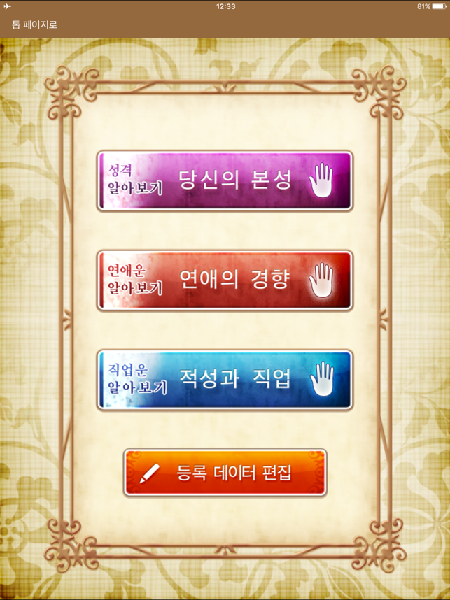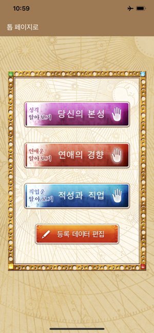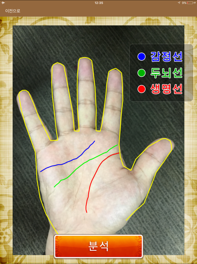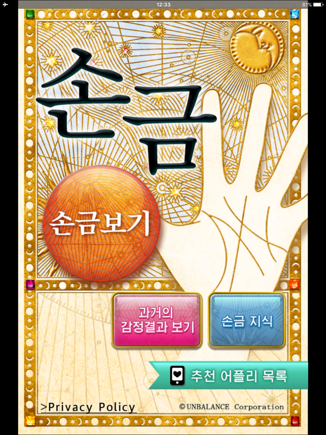 일본에서 인기 있는 손금보기 어플리가 드디어 등장!!『손금』는 iPhone 내장 카메라로 당신의 손바닥을 촬영하는 것만으로 본격적인 「손금보기」가 가능한 어플리입니다.지금까지 손금에 관한 책을 봐도, 「자신과 같은 손금 타입을 찾을 수 없다」「가는 선을 비교해 보는 것이 귀찮고, 자기 판단이 어렵다」…라고 느끼고 있던 분도 부담 없이 이용하실 수 있습니다.언제 어디서나 바로 감정할 수 있는 본 어플리로 손금보기의 매력을 꼭 체감해 보세요!【어떻게 점을 보나요?】●iPhone내장 카메라로 당신의 손바닥을 촬영합니다. *앨범에서 선택하는 것도 가능합니다.(iPod touch/iPad인 분은 앨범으로부터의 선택만 됩니다)●찍은 손금은 「저장」할 수 있습니다.※저장해 두면, 몇 번이나 촬영하는 수고를 줄일 수 있으므로 편리합니다.●촬영한 당신의 손금사진은 오리지널 인공지능(AI) 프로그램으로 손금의 주요선을 중심으로 해석됩니다.●그 자리에서「성격」「연애」「일」등, 당신의 본질과 운명을 해독하고, [감정결과]를 표시합니다. ※감정결과는 저장되어, 나중에 다시 읽을 수 있습니다. 【선명하게 촬영하는 요령】・「검정」또는「무늬 없는 짙은 색」의 배경을 준비해 주세요. ・다섯 손가락을 벌려「손 전체」를 찍어 주세요.◎손금이 선명하게 찍히도록 촬영해 주세요.