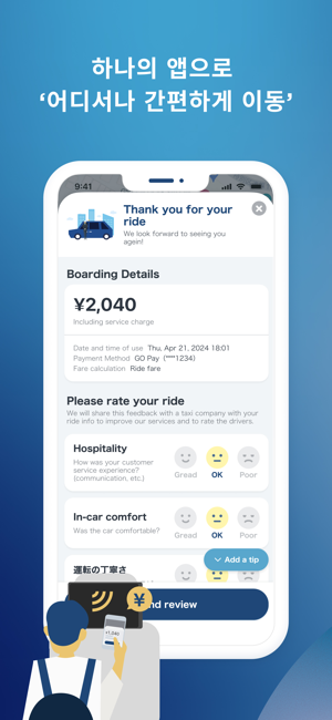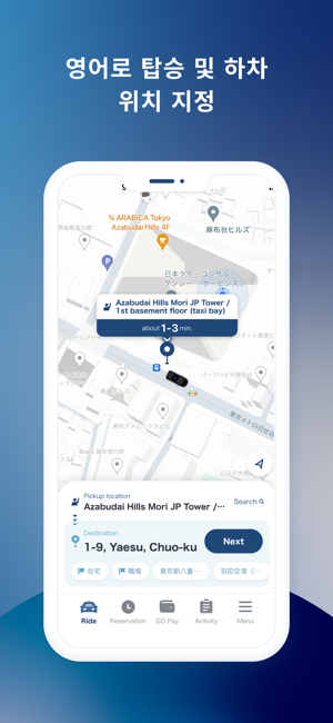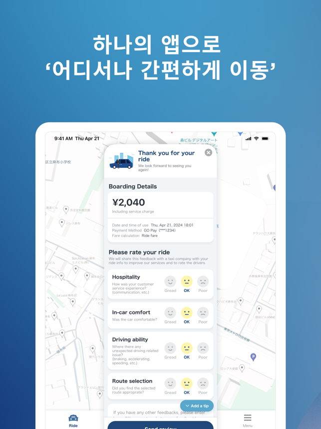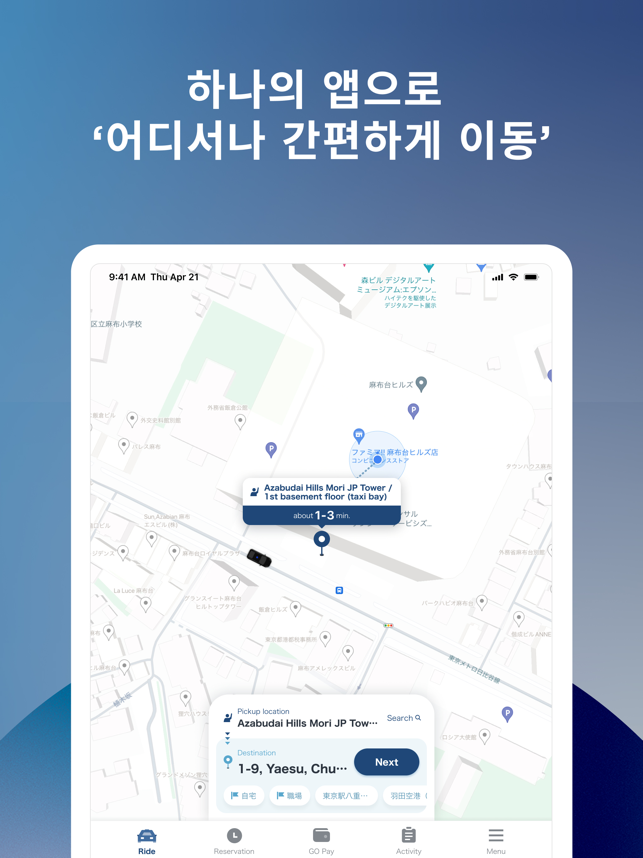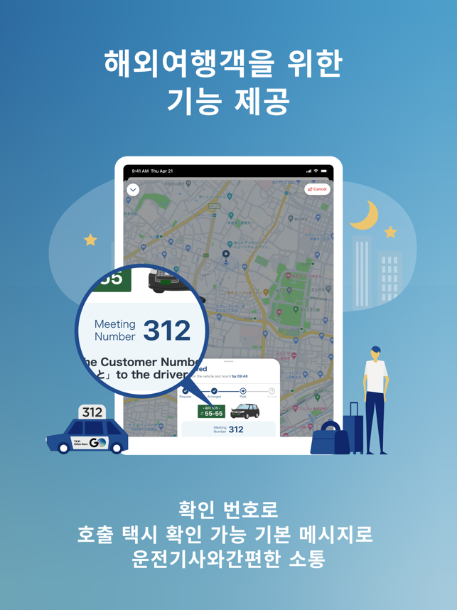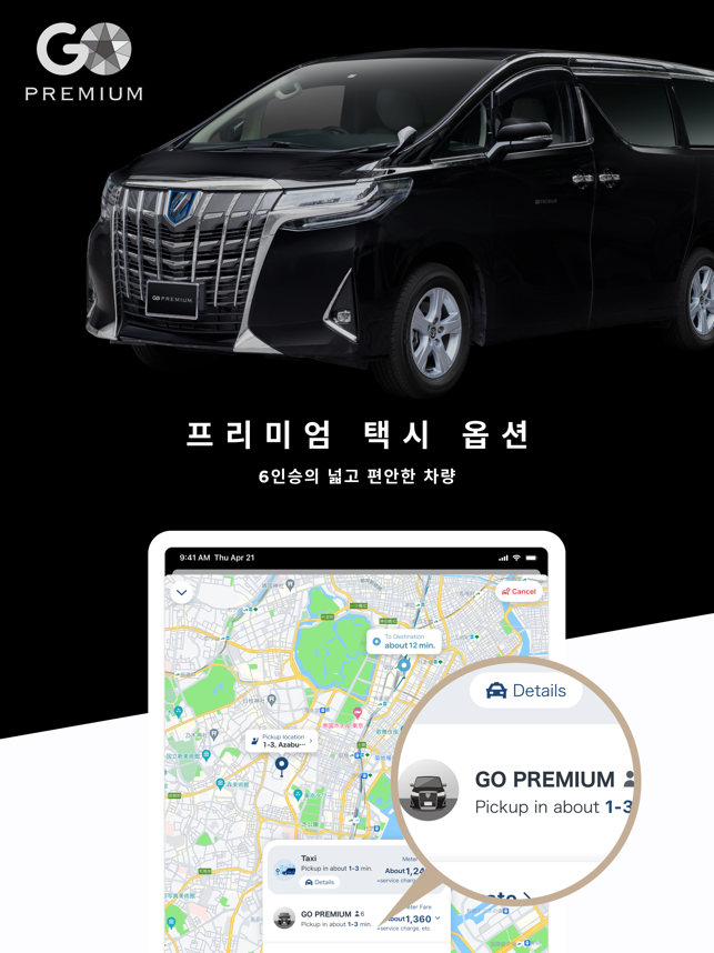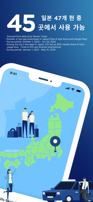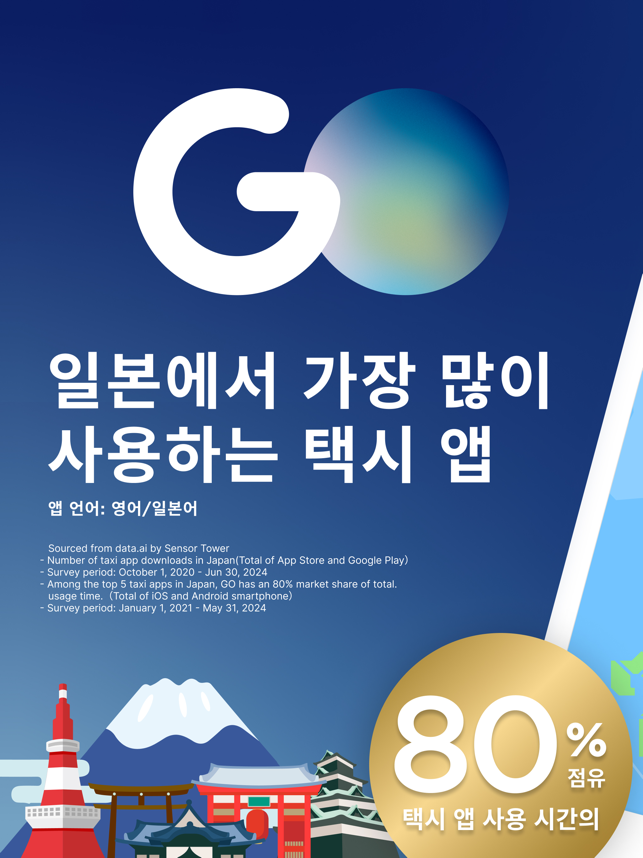 ・ 일본에서 가장 많이 사용하는 택시 앱(택시 예약 앱) GOGO는 홋카이도, 도쿄, 교토, 오사카, 후쿠오카, 오키나와 등 주요 관광지를 포함한 일본 47개 현 중 45개에서 운영 중인 1위* 택시 앱(차량 앱)입니다.일본에서 택시 앱 사용 시간의 80%를 GO가 점유하고 있습니다.이제 일본 이외의 휴대폰 번호로도 가입할 수 있습니다.* data.ai by Sensor Tower 설문조사 결과- 일본 내 택시 앱(차량 앱) 다운로드 수- 설문조사 기간: 2020년 10월 1일~2024년 6월 30일- 일본 내 상위 5개 택시 앱 중 GO의 시장 점유율은 총 사용 시간 기준 80%입니다.- 설문조사 기간: 2021년 1월 1일~2024년 5월 31일*실제 앱 화면과 차이가 있습니다.・ GO로 간편하게 일본을 여행하기GO를 사용하여 가장 가까이 있는 택시(차량)를 호출하면 목적지까지 쉽게 이동할 수 있습니다. 더 이상 길가에서 택시를 잡을 필요가 없습니다!- 어디에서든 시간에 맞춰 간편하게 이동- 스트레스 없는 택시 이용- 최적의 택시(차량) 유형 선택・ GO라는 하나의 앱에서 택시 호출부터 결제까지 완료택시 호출부터 승차 확인, 요금 결제까지 모든 것을 GO 앱에서 처리하고 일본 어디에서든 간편하게 이동하세요.・ GO 프리미엄: 대형 럭셔리 밴 호출GO 앱을 사용하면 높은 평점을 자랑하는 전문 운전기사를 요청해 최대 6명까지 탑승할 수 있는 고급 밴을 호출할 수 있습니다. 본 서비스는 현재 도쿄의 다음 15개 구에서 이용할 수 있습니다. 지요다구, 주오구, 미나토구, 신주쿠구, 분쿄구, 다이토구, 스미다구, 고토구, 시나가와구, 메구로구, 오타구, 세타가야구, 시부야구, 나카노구, 도시마구*다이토구, 스미다구, 고토구, 시나가와구, 오타구, 세타가야구, 나카노구, 도시마구 일부 지역에서는 이용할 수 없습니다.자세한 내용은 아래 웹페이지를 참조하세요.https://go.goinc.jp/en/premium・ 예약 서비스: 특정 날짜 및 시간에 택시 예약하기예약 서