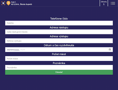 Ponkame zdarma jednoduch formulr ktor za 5 mint vlote na svoju web strnku a zkaznci si mu objednva taxi cez internet aj v mobile Zadaj adresu nstupu vstupu as a poet ud Aplikcia dostatone vopred informuje ofra v porad o plnovanej zkazke