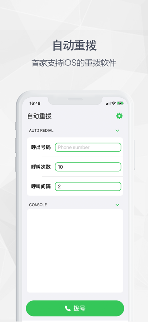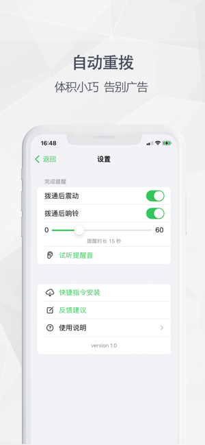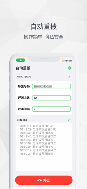 - 一款适用于iOS的自动重拨软件,可重复拨打直到拨通为止- 拨通后可以设置响铃后震动提醒,避免错过通话- 不使用通讯录,不联网,无隐私泄漏风险- 体积小巧,简洁无广告嘟~嘟~嘟~ 您拨打的电话暂时无人接听。电话的另一端可能是至亲,可能是牵挂,可能是爱恋...嘟~嘟~嘟~ 您拨打的电话正在通话中,请稍后再拨。可能有更紧急的消息,也可能是一张车票或者一个挂号...总有那样的心急如焚却又无法一直守着电话。所以,有我。 New idea, New auto redial 注: 如果对方有自动应答或者机器应答,该app不适用,请注意甄别下载。另,请注意不要对别人造成不好的打扰。
