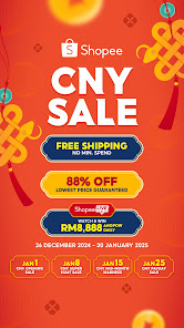 Slither into the new year with our monthlong CNY Sale happening from 26 December to 30 January Enjoy 88 Off Lowest Price Guaranteed Free Shipping with No Min Spend and tons more exciting promos that will get your 2025 off to a sizzling start Plus tune in to Shopee Live daily and win angpows worth RM8888 each Shopping online doesnt get any HUATer than this