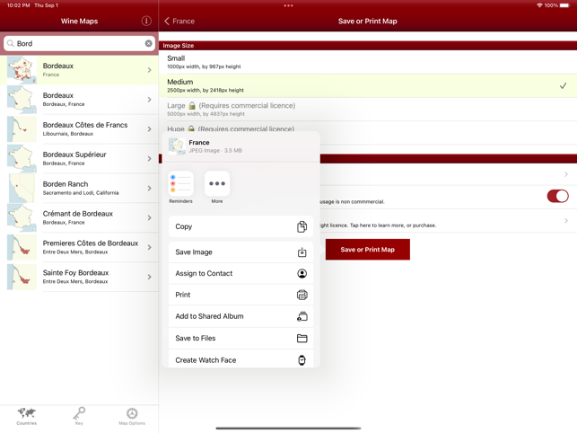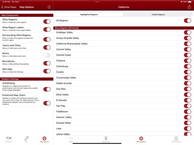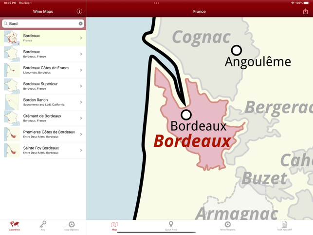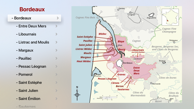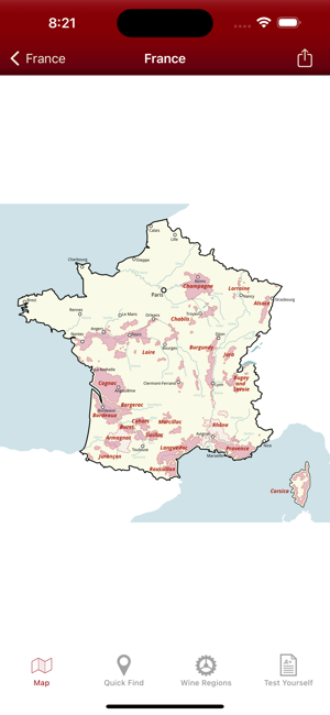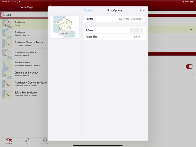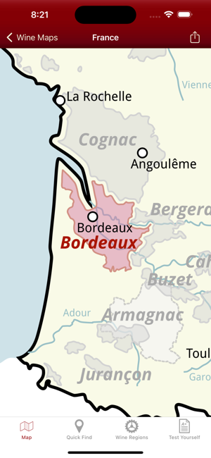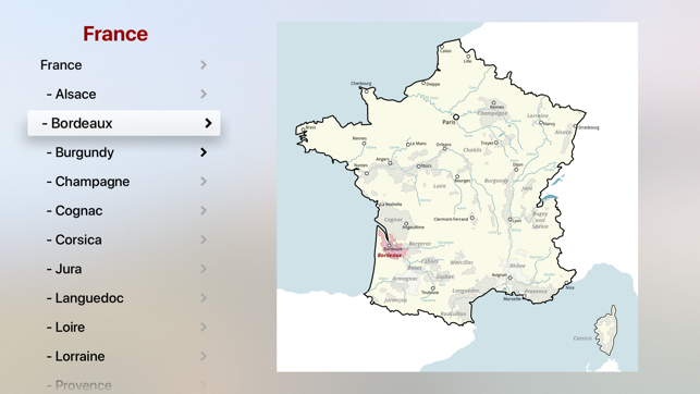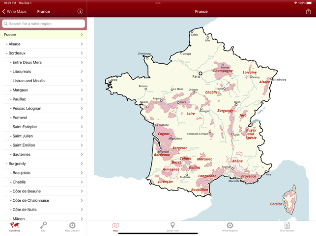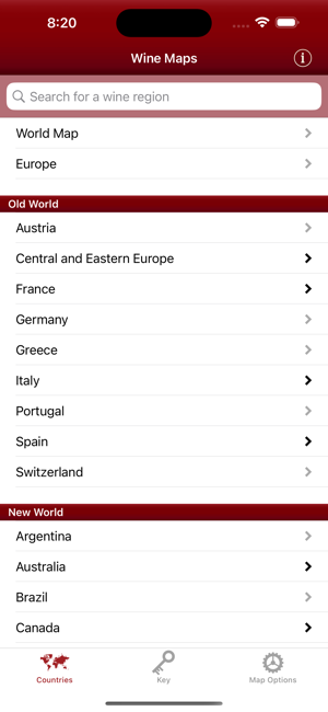 Wine Maps provides a handy visual reference, for the wine regions in twenty countries around the world. Its a great tool for anyone looking to learn more about the world of wine, and even better for those looking for maps to study from. It's perfect for those teaching others about wine, and Wine Maps provides a number of ways of exporting or printing maps. Wine Maps focuses exclusively on mapping the wine regions of the world. It offers one hundred and twenty two maps, defining the wine regions. It is NOT an encyclopaedia of wine, and does not give any textual definitions or comment. Wine Maps is a purely visual reference, which allows you to search for the location of a wine region. With the exception of the top wineries in Bordeaux, individual vineyards do not appear on the maps. There's just too many of them!Each map is one or two taps away from the main screen. Simply choose from the main wine region list, and you instantly have a map of that region. You can search for regi