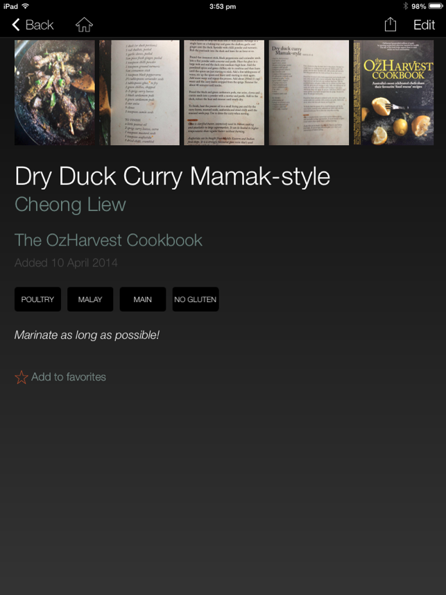 "App of the Week" - Sydney Morning Herald.#1 ranked paid Food & Drinks app!Reviews: "Exactly what I needed", "Love, Love, Love", "Fantastic", "Indispensable" - see more in Reviews.Don't TYPE recipes into an app - with SnapRecipes, simply snap photos of your favorite recipes, from magazines, newspapers, your cookbooks, websites or granny’s notes, file using simple one-touch categories. It's your own personal recipe folder. No more torn out pages or pieces of paper to lose. No more hoarding old magazines with one recipe inside, or losing that much-loved recipe somewhere in your pile of cookbooks. And no need to type out your recipes - simply read them right off the photos.Key features: - Simple and easy to use- One app for iPhone and iPad- Add recipes quickly with hardly any typing- Sync between your iPhone and iPad via iCloud- Take your recipes with you when you travel- Share your recipes with friends by email- Eas