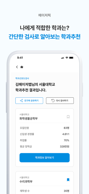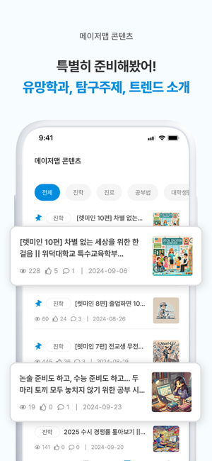 고등학생 진로진학 필수 플랫폼, 메이저맵을 통해 학과를 추천받고 학과·대학·직업 콘텐츠를 탐색해보세요.학과추천서비스 메이저픽 - 내 관심사에 기반한 간단한 검사로 내게 맞는 4년제 대학의 학과를 추천받아 보세요.학과·대학·직업정보 탐색- 학과별 워드클라우드를 통해 학교와 학과 특성에 맞는 핵심 키워드를 알아보고 내 목표학과를 설정해보세요.- 고교학점제를 앞두고 과목 선택이 고민이신가요? 학과별로 적합한 선택과목을 알 수 있어요.- 메이저맵이 AI로 분석한 학과별 유사학과 지도로 폭넓은 진학계획을 세워보세요.- 현업 근로자 설문을 기반으로, 직업에 대한 자세한 설명을 제공해드려요.메이저맵 콘텐츠- 메이저맵이 유망학과 정보를 추천해드릴게요. 학과 입시정보부터 학과 커리큘럼, 졸업 후 진로까지. 자세한 정보를 알 수 있어요.- 탐구주제 선정이 어려운가요? 최신 트렌드를 분석해 적절한 탐구주제를 소개해 드릴게요.- 매일 업로드한 콘텐츠를 앱 푸시 알림으로 알려드릴게요. 잊지 않고 콘텐츠를 볼 수 있어요.- 관심있는 콘텐츠가 있나요? 콘텐츠를 북마크하고 언제든 열람하세요. 학과라운지- 학과 선배가 알려주는 생생한 학과정보, 학과라운지를 통해 학과생활을 미리 경험해보세요.- 학과활동 사진부터 입시준비 꿀팁, 전공과목 정보, 대표직업 인터뷰까지 학과라운지를 통해 볼 수 있어요.※ 서비스 접근 권한 안내- 메이저맵을 이용하기 위해서는 아래와 같은 선택 접근 권한이 필요합니다.- 선택 접근 권한에 동의하지 않아도 서비스 이용이 가능하며, 동의 여부는 앱 내 ‘마이페이지’ 메뉴에서 확인할 수 있습니다.[ 선택 접근 권한 ]- 알림: 앱 푸시 알림 전송에 사용※ 문의 및 제안사항은 언제든지 고객센터로 남겨주세요.- 이메일: hihi@majormap.net- 대표번호: 070-5176-7799