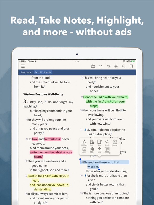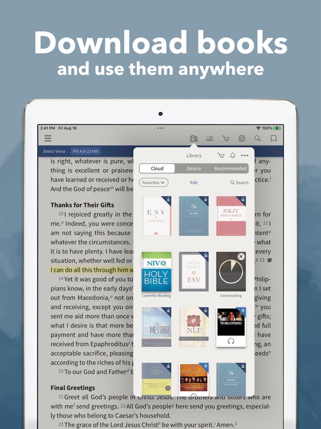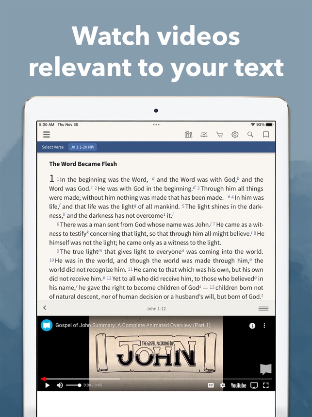 NIV Bible App equips you with easy-to-use Bible study tools so you can read and study the Bible for yourself.READImmerse yourself in God’s Word with your favorite Bible translation downloaded to your device. Use 5 of the most popular Bible translations for free along with many other free resources. Trying to get back into the Word? There are tons of devotional reading plans, from one week to a year to get you deep into scripture. STUDYWith thousands of titles available to purchase on the Olive Tree store you can be confident in building yourself a solid library of study resources to keep you studying God’s word for years to come!Not sure where to start? Check out one of our study packs in subscription form. They’re hand-picked study tools PLUS guided training to help you get the most out of studying the Bible.LISTENAudio Bibles and books! Choose from simple reading or dramatized Bibles to thousands of audio book titles for Christian living.WATCHOlive Tree is partnering with BibleProjec