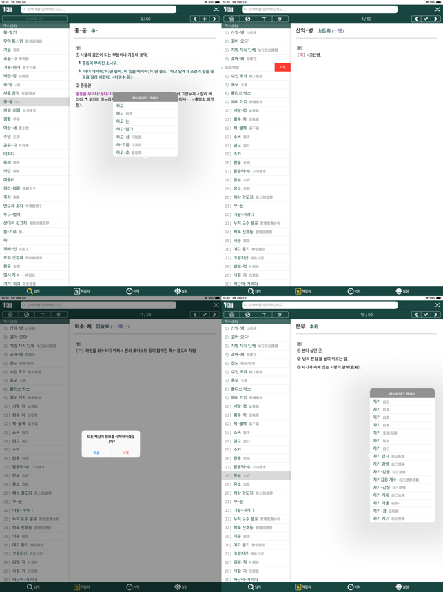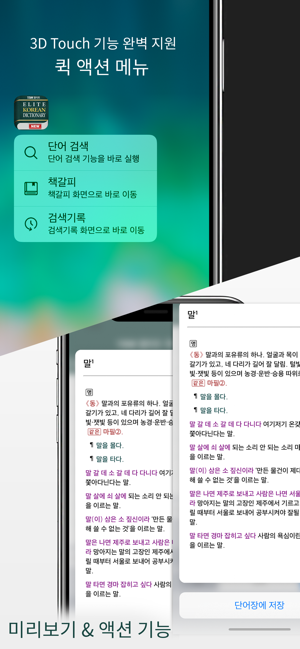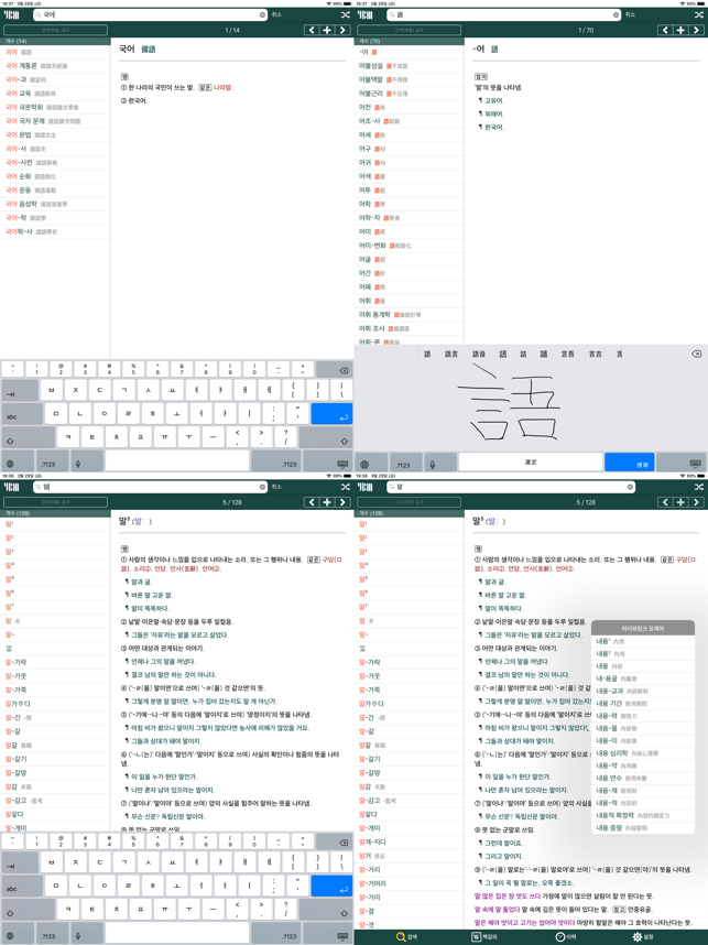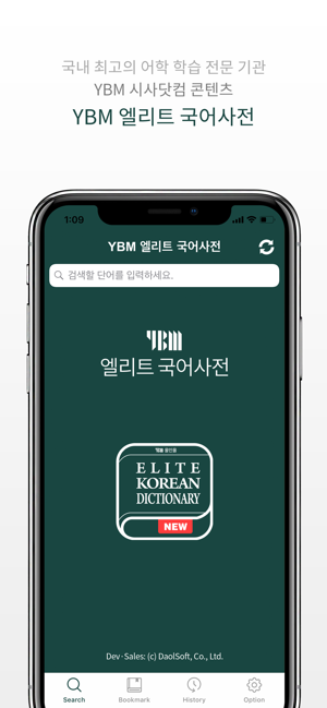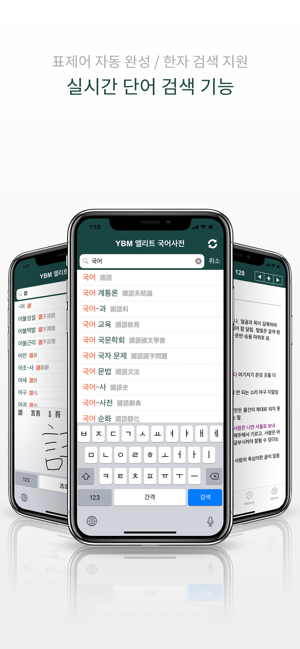 ● 최신 iPhone 단말기(iPhone 14, iPhone 14 Plus, iPhone 14 Pro, iPhone 14 Pro Max) 단말기 해상도 지원 ●● iOS 15, 16 호환성 지원 ●■ iOS 9 UI 완벽 지원 버전 관련 사항 ■- iOS 9 UI 완벽 지원 업데이트 버전이 출시되었습니다.- 3D Touch(퀵 액션, 미리 보기), Slide Over/Split View(화면 분할) 등 iOS 9 새로운 기능 완벽 지원. 앞으로도 보다 양질의 프로그램이 되도록 더욱 더 노력하겠습니다.▶ 버전 v1.3부터는 iOS 버전 v6.0 미만의 단말기는 지원되지 않습니다. 이점 많은 양해 부탁드리겠습니다. ◀※ 한자 검색 방법: 단말기에서 "설정" 어플->일반->키보드->새로운 키보드 추가...->중국어->번체(필기) 선택 후 App에서 키보드 필기 인식으로 변경 후 검색Elite Korean Dictionary for iPod/iPhone contains all headwords from the newest edition of "Sisa Elite Korean Dictionary" published by YBMsisa.com. I. BookAs time goes by, the importance of essay writing is getting bigger. However, ability of essay writing is not increased in a single day. To get high marks from various exams that assess the ability of writing, a habit of keeping a Korean dictionary at hand always and reviewing your own writing and speaking is needed. Beyond a reference book used to look for meanings or