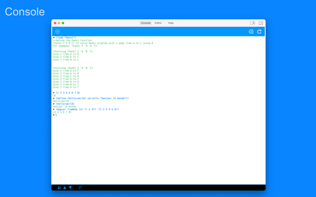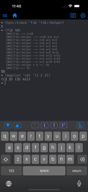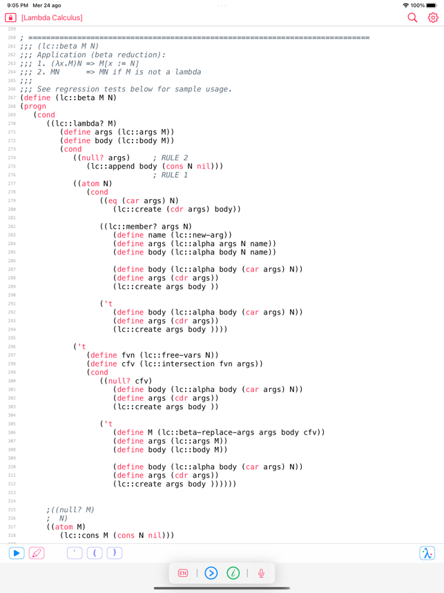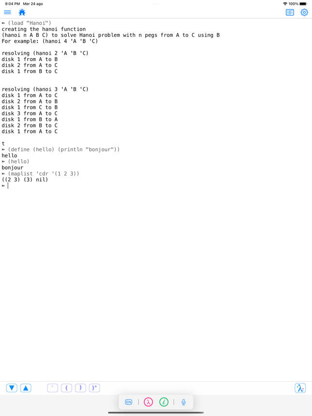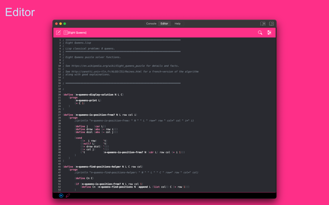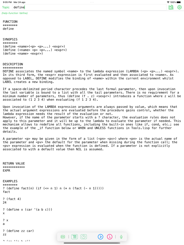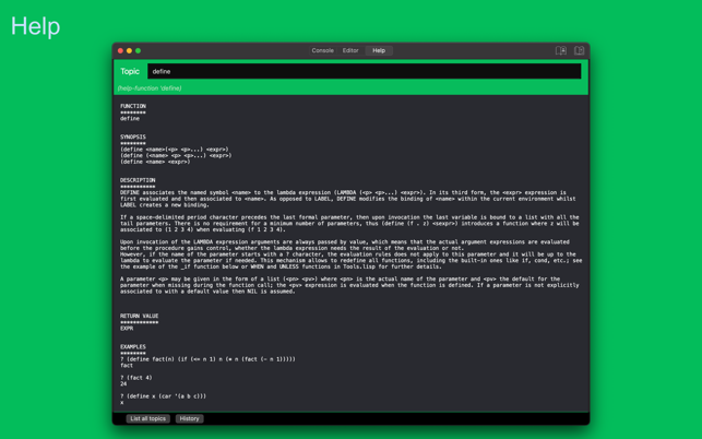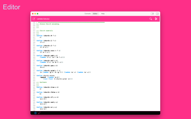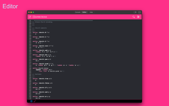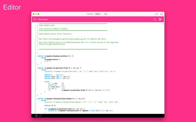 My Lisp is a complete and universal Lisp environment running directly on the iPhone, iPad, and Mac. This interpreter is true to the original John McCarthy Lisp implementation with the fundamental 7 operators quote, atom, eq, car, cdr, cons, cond, along with lambda and label. My Lisp also contains core and mathematical operators borrowed from other Lisp dialects (Le Lisp, Lisp 1.5, MacLisp, Common Lisp and Scheme to name a few) to make it easy to learn, program, and most importantly, enjoy Lisp. It also features built-in functions for advanced mathematics, including complex numbers and numerical analysis (roots and zeros finder, integral approximation). The complete description of the fundamental, core, and built-in functions is available using a set of library functions completely written in My Lisp.My Lisp offers an interpreter and an editor, all working on the iPhone, iPad, and Mac, and most importantly, without requiring any server connection, that is, the interpreter is executing l