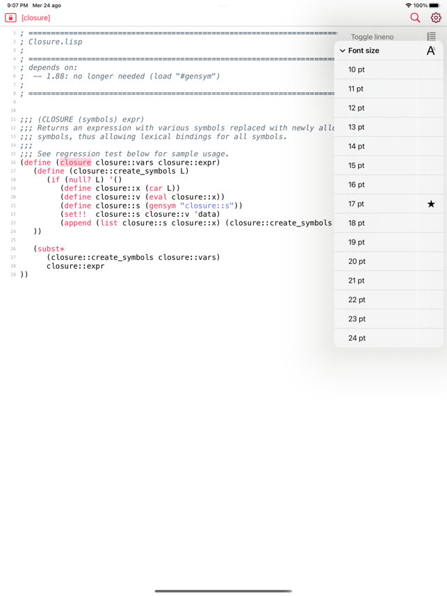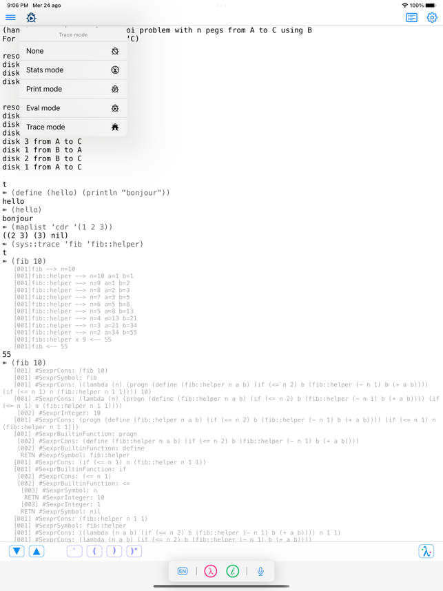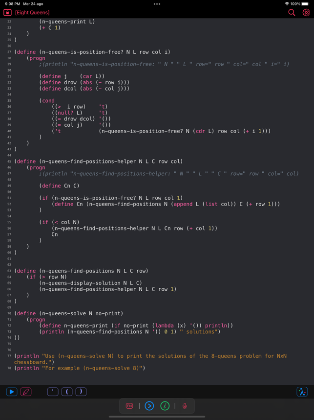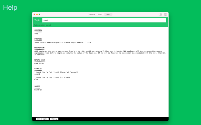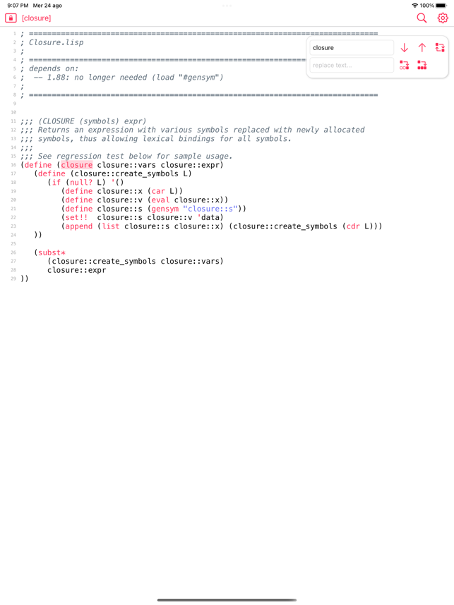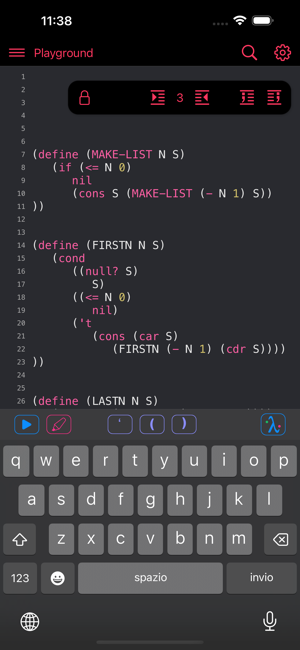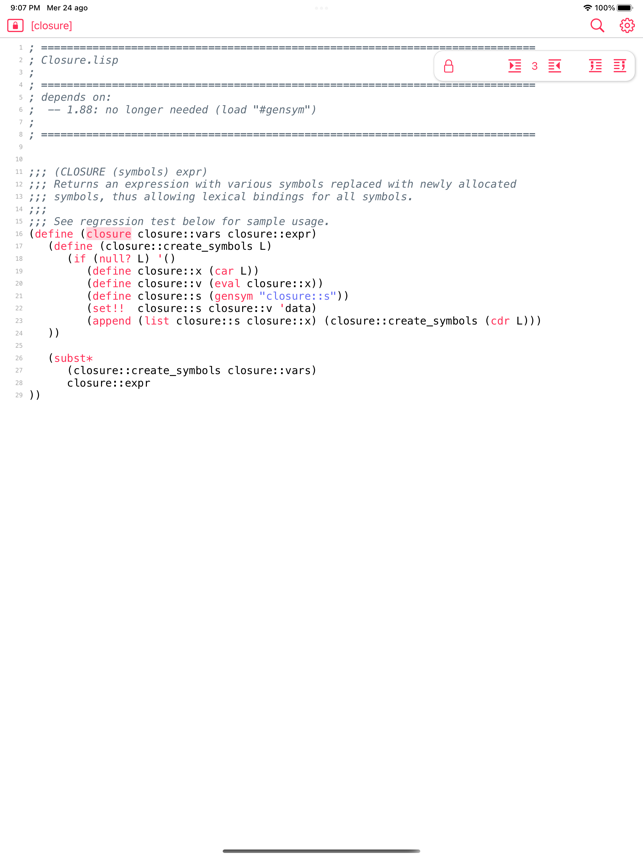 My Lisp is a complete and universal Lisp environment running directly on the iPhone, iPad, and Mac. This interpreter is true to the original John McCarthy Lisp implementation with the fundamental 7 operators quote, atom, eq, car, cdr, cons, cond, along with lambda and label. My Lisp also contains core and mathematical operators borrowed from other Lisp dialects (Le Lisp, Lisp 1.5, MacLisp, Common Lisp and Scheme to name a few) to make it easy to learn, program, and most importantly, enjoy Lisp. It also features built-in functions for advanced mathematics, including complex numbers and numerical analysis (roots and zeros finder, integral approximation). The complete description of the fundamental, core, and built-in functions is available using a set of library functions completely written in My Lisp.My Lisp offers an interpreter and an editor, all working on the iPhone, iPad, and Mac, and most importantly, without requiring any server connection, that is, the interpreter is executing l