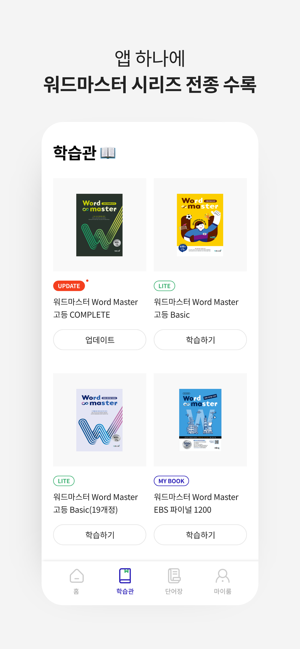 빵빵한 기능으로 무장한 스마트 단어암기 메이트! 워드마스터 콘텐츠를 앱으로 공부하세요! ▶워마 콘텐츠가 한곳에워드마스터 시리즈를 앱 하나에 전부 담았어요.원하는 콘텐츠를 간편하게 공부하세요.▶기능을 강화한 단어학습 카드-북마크 : 마지막으로 외운 단어를 체크해 두면 언제든지 북마크한 단어부터 학습이 가능해요-예문 청취 : 단어뿐 아니라 예문도 청취할 수 있습니다.-관련어 : 유의어 반의어 등 관련어들로 어휘 학습을 더 깊게 해보세요-숨기기 : 손으로 뜻을 가린 채로 외웠는지 테스트하셨나요? '노출 방식'을 '영어만'으로 설정해 두면 한글 뜻이 사라져서 쉽게 암기 여부를 확인할 수 있어요▶안 외워지는 단어만 모아보는 단어장안 외워지는 단어는 단어장에 추가하여 따로 공부하세요. 단어장의 단어만 따로 모아 테스트를 하거나 오디오 모드 학습도 가능합니다. ▶총 3가지 유형의 테스트'한글 뜻 맞추기'는 물론이고 '영단어 맞추기', '스펠링 테스트'까지 다양한 테스트 옵션으로 외운 단어를 더 확실히 점검하세요.▶들으며 외우는 오디오 모드단어, 뜻, 예문을 골라 원하는 횟수만큼 반복하여 청취하세요. '수면모드'를 사용하면 수면 타이머가 동작하여 자동으로 오디오 재생이 중지되어 자면서 들어도 방해가 되지 않아요. ▶실력 진단 후 맞춤 콘텐츠 추천'레벨테스트' 기능을 사용하면 내 실력을 정확히 측정한 후 실력향상에 도움이 되는 콘텐츠를 추천해 드려요.▶기기가 변경되어도 학습 이력은 그대로워드마스터 학습앱은 계정에 학습 데이터가 연동되기 때문에 기기가 바뀌어도 진도율이나 단어장에 저장한 단어들이 그대로 유지돼요.▶구 워드마스터 앱 구매자 무료 다운이전에 워드마스터 개별 앱을 구매하셨다면 구 워드마스터 앱에서 발급되는 인증코드를 통해 워드마스터 학습앱에서 무료로 콘텐츠 다운로드가 가능합니다. [앱 접근 권한 안내]-저장공간 (필수) : 기기에 콘텐츠를 다운로드할 때, 1:1