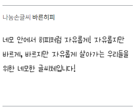 폰트소개 여러분과 AI가 함께 만든 새로운 나눔손글씨 글꼴을 소개합니다뜻깊은 소개말이 담긴 총 109종의 손글씨 글꼴한글한글 아름답게 캠페인과 네이버 클로바가 함께합니다사용범위나눔손글씨 글꼴은 기업 및 단체 또는 개인 누구나 무료로 사용할 수 있습니다 다만 나눔손글씨 글꼴을 유상으로 제공 판매 배포하는 것은 금지됩니다한글날 손글씨 공모전 참여 시 입력한 글꼴명 및 글꼴 소개말은 임의로 변경되었을 수 있습니다lt폰트배포의 건gt소프트쉐어에서는 재배포가 허용된 무료 폰트에 한정하여 배포하고 있습니다본 페이지에서 제공하는 폰트 사용 범위 저작권 정보는 최신 정보가 아닐 수 있습니다폰트와 관련된 자세한 사항 및 상업적 사용에 대한 상세 정보는 개발자에 직접 문의하시길 바랍니다자동설치형 폰트EXE는 다운로드 후 해당 파일을 실행하시면 자동 설치됩니다Windows XP는 수동설치 폰트는 다운로드 후 시작버튼 gt 제어판 gt 모양 및 개인설정 gt 글꼴에 다운로드 받은 폰트파일을 넣습니다Windows 7에서는 폰트파일을 더블클릭 또는 우클릭 후 설치 메뉴를 선택합니다TTF True Type Font는 Window용 OTF Open Type Font는 Mac용 폰트 입니다