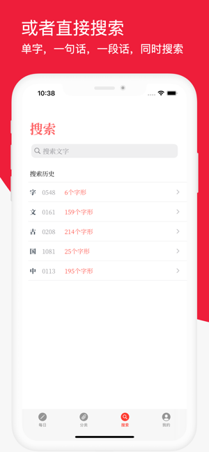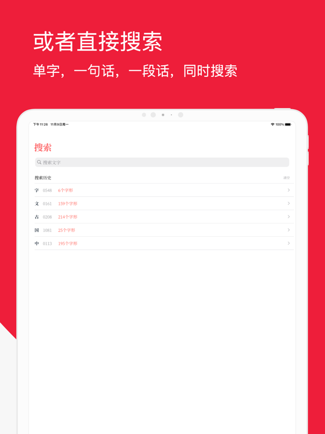 汉字是迄今为止持续使用时间最长的文字,已有六千多年的历史,也是上古时期各大文字体系中唯一传承至今者,中国历代皆以汉字为主要的官方文字。在古代,汉字还充当东亚地区唯一的国际交流文字,20世纪前仍是日本、朝鲜半岛、越南等国家的官方书面规范文字。从仓颉造字的古老传说到100多年前甲骨文的发现,历代中国学者一直致力于揭开汉字起源之谜。中国文化源远流长,而汉字则是我们的瑰宝。《字形》将74344个汉字字形通过图片的形式,按照时间顺序,根据最新国家通用规范汉字表给出6059个汉字的演变,并标明每个汉字的拼音、笔画、部首等。在《字形》中, 汉字将按照以下形式的时间轴顺序展示汉字的演变历史。1、甲骨文2、金文(又叫钟鼎文),涵盖商、西周、春秋、战国时期3、简帛4、简牍5、说文解字6、六书通## 甲骨文甲骨文,又称契文、甲骨卜辞、或龟甲兽骨文,是中国目前已知最早的成系统的文字形式,为世界四大古文字之一。它具备了象形、指事、会意、形声、转注、假借等造字方法,标志着已进入了成熟阶段。殷墟甲骨文是殷王朝占卜的记录,中国古代甲骨占卜有着悠久的历史,殷墟时期则是占卜最盛行的时期,商王和贵族几乎每事必卜,占卜成为商代社会生活的重要组成部分。甲骨的纳贡、收贮、整治、钻凿及占卜方法、程序和卜辞的语法、辞例等形成一套严格而有系统的制度。据甲骨文记载,殷代已有专门掌管占卜和纪录的贞人,见于卜辞的贞人约有上百人。占卜涉及内容包括祭祀、天象、年成、征伐、王事等,甚至于商王游猎、疾病、做梦、生子等。商代以后,甲骨占卜逐渐失去了其显赫地位。殷墟甲骨文的发现,见证了已经消逝的商代占卜制度,为研究中国文化史提供了重要的材料。目前殷墟发现有大约15万片甲骨,4500多个单字。从甲骨文已识别的约1500个单字来看,甲骨文已具备了现代汉字结构的基本形式,其书体虽然又经历了金文、篆书、隶书、楷书等书体的演变,但是以形、音、义为特征的文字和基本语法保留下来,成为今天世界上五分之一的人口仍在使用的方块字,对中国人的思维方式、审美观产生了重要的影响,为中国书法艺术的产生与发展奠定了基础。甲骨文也因此成为世界四大古文字中唯一传承至今的文字。由甲骨文演变发展而来的汉字,在传播华夏文化、促成中国大一统国家的形成与巩固方面发挥了重要作用。## 金文金文是中国古代的一种书体名称,指的是铸造在殷周青铜器上的铭文,也叫钟鼎文。商周是青铜器的时