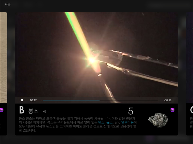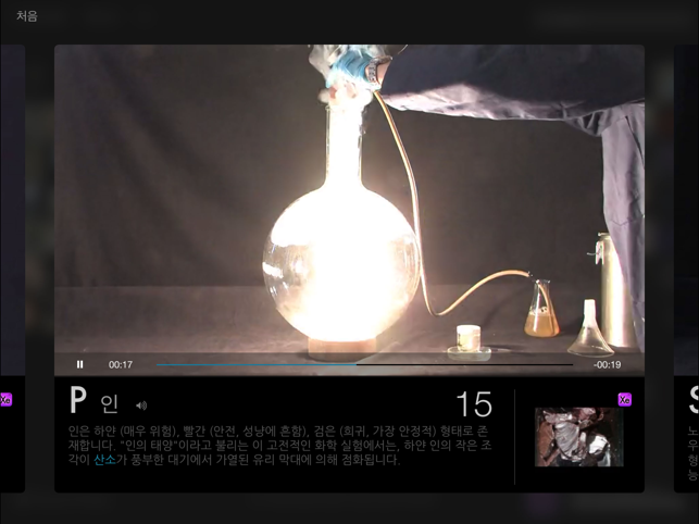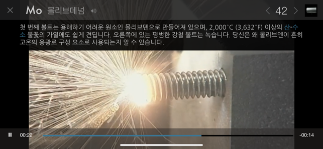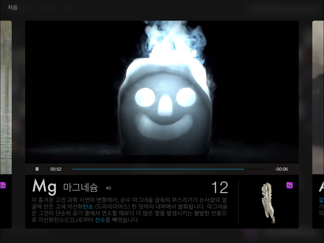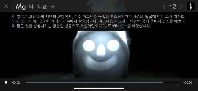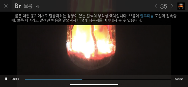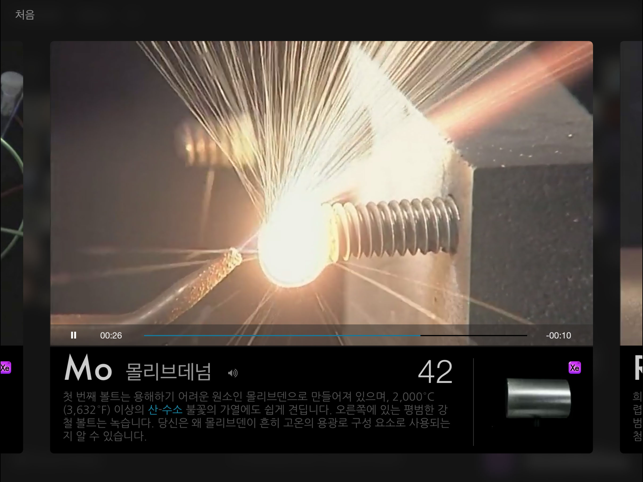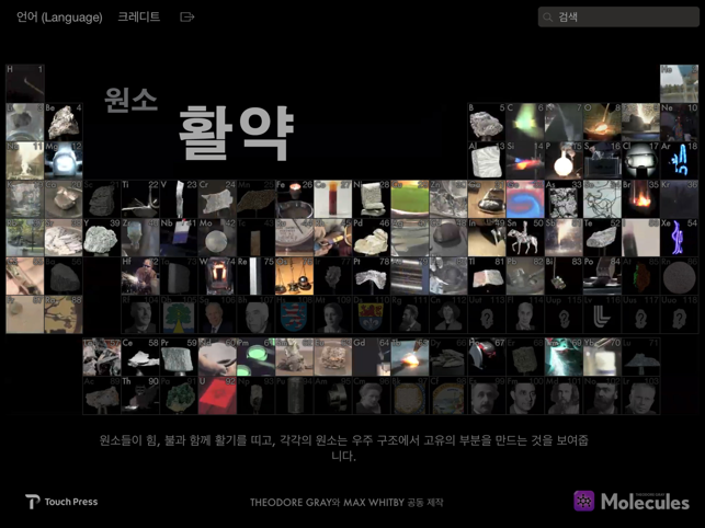 주기율표가 원소들의 기묘하고 경이로우며 때로는 두려운 특성에 관한 79개의 비디오 탐험과 함께 활기를 띱니다. '원소'의 화상 교재와 앱의 저자인 시어도어 그레이(Theodore Gray)와 협력하여 BAFTA 수상 경력에 빛나는 맥스 휘트비(Max Whitby)에 의해 촬영되었고 이전에는 소수의 박물관 전시물에서만 만날 수 있던, 이것은 무엇이 각 원소를 유일무이하고 대단히 흥미롭게 만드는지를 탐험하고 설명하기 위해 현재까지 만들어진 동영상 중 가장 아름답게 촬영된 작품입니다. 높은 반응성을 가진 루비듐을 물에 빠뜨렸을 때 어떤 일이 발생하는가? 혹은 포탄이 수은 웅덩이에 놓였을 때는? '원소의 활약'은 기묘한 것에서 절묘한 것에 이르기까지 (거의) 모든 원소에 대한 명확한 설명을 화재, 분해 혹은 중독에 의한 사망의 위험이 없이 편안하고 안전하게 아이패드에서 볼 수 있도록 한 자리에 모두 모아 보여줍니다. '원소의 활약'은 독립형 앱으로 작동하지만, 원래의 앱인 '원소: 시각적 탐험'과 결합하였을 때 더욱 빛을 발합니다. 함께 설치되면 두 개의 앱은 서로를 발견하여 연동되며, 원래의 앱에서의 응시 대상으로서의 원소와 두 번째 앱의 역동적인 활약의 대상인 원소 사이의 보기를 매우 원활하게 넘겨볼 수 있도록 해 줍니다. 이제 완전하게 번역: 한국어, 네덜란드어, 독일어, 러시아어, 스웨덴어, 스페인어, 영어, 이탈리아어, 일본어, 중국어(간체), 카탈로니아어, 크로아티아어, 터키어, 포르투갈어, 폴란드어, 프랑스어, 핀란드어
