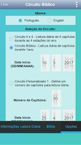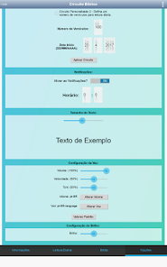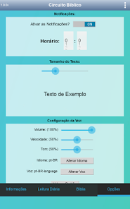 Aba Opes Disponveis todas as configuraes que podem ser feitas no Circuito Bblico idioma seleo do circuito de leitura bblica notificaes tamanho do texto configuraes de voz do brilho da tela e categorias de versculos marcados