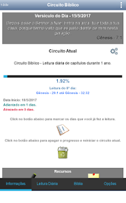 Aba Informaes Sempre acessada quando da abertura do circuito bblico onde se encontram as informaes do circuito atual tais como progresso leitura do dia nmero de dias adiantados ou atrasados dentre outros Tambm possvel visualizar as anotaes e versculos marcados bem como o quadro de medalhas e a Classificao