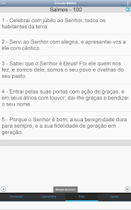 O aplicativo possui quatro abas na parte inferior sendo elas Informaes Leitura do Dia Bblia e Opes