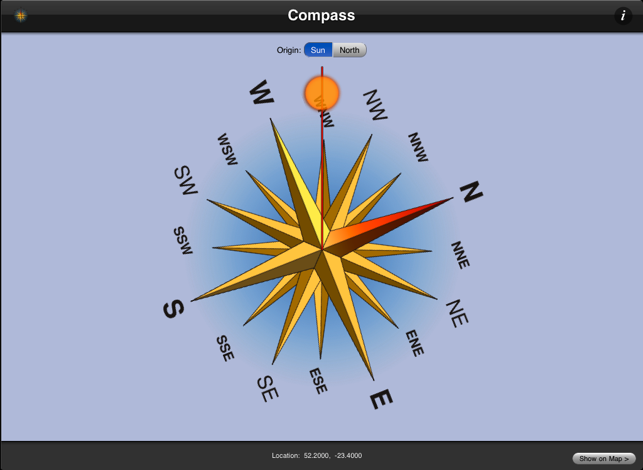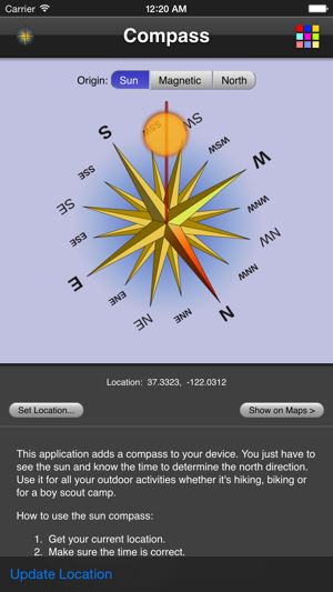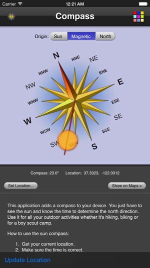 This application adds the a compass to your device. It either uses the built in magnetic compass (if available) or provides a sun compass (You just have to see the sun and know the time to determine the north direction). Use it for all your outdoor activities whether it's hiking, biking or for a boy scout camp. The sun compass is not affected by magnetic anomalies.