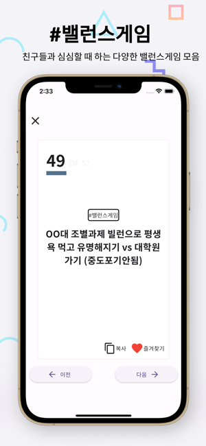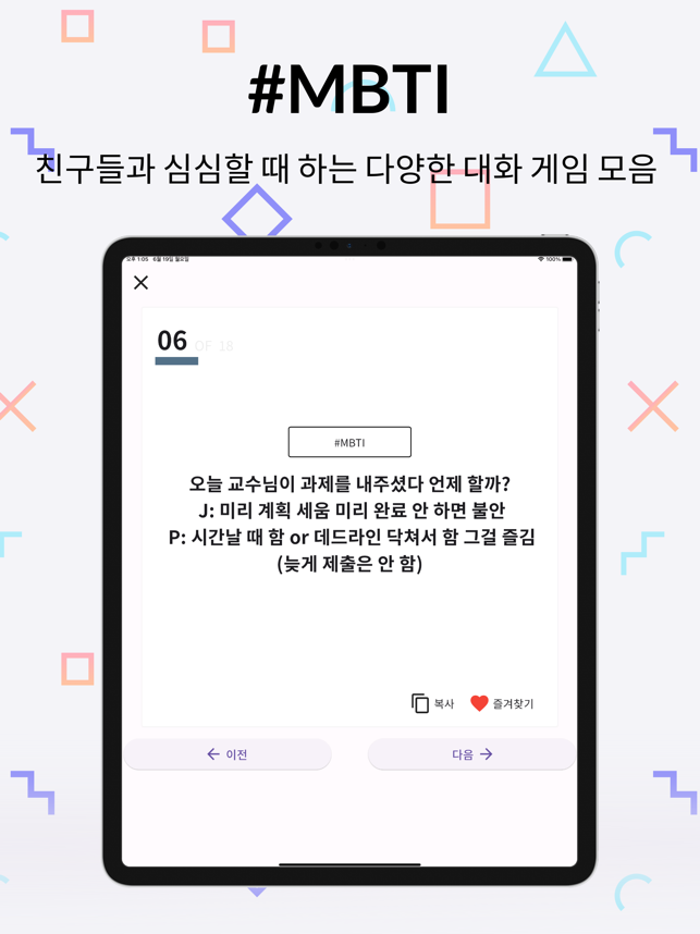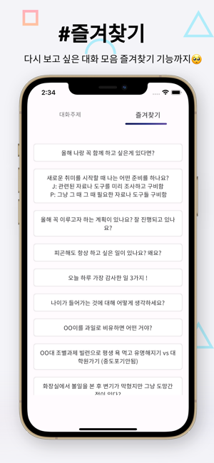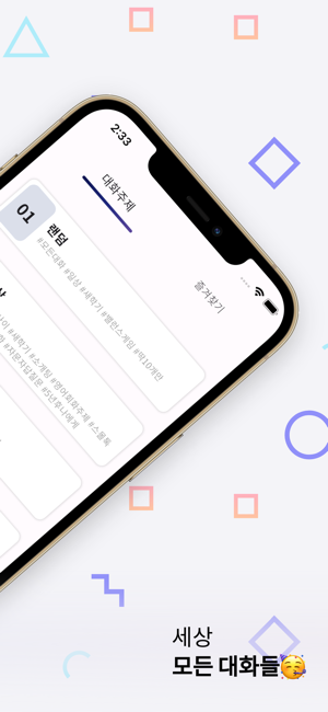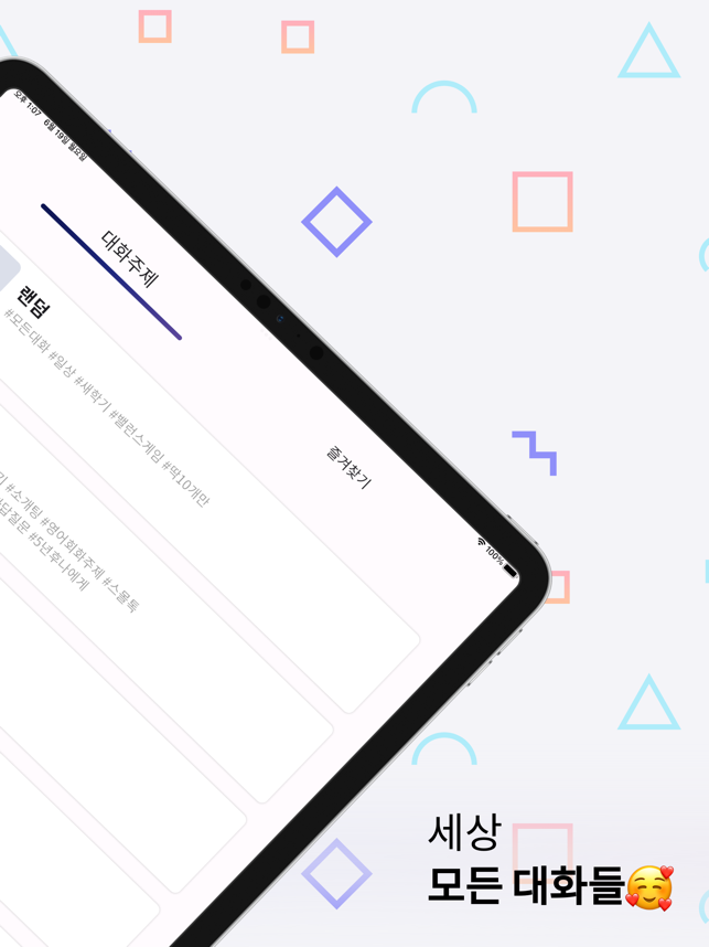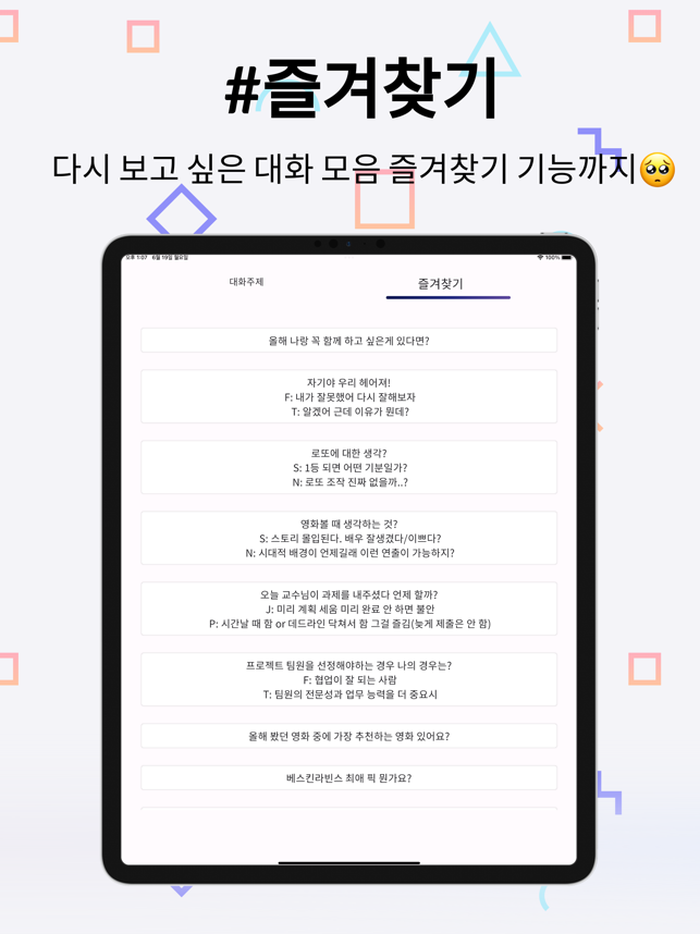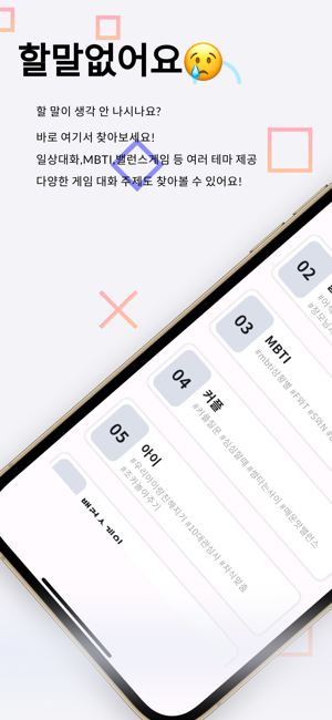 할 말 없을 때 추천합니다.말해야 하는 상황에 할 말은 없고...대화 주제가 필요한 모든 분의 맞춤형 대화 카드! 일상 대화, 소개팅, 커플, 가족, 친구 등 다양한 테마의 대화 모음을 제공합니다! 그뿐만 아니라 친구들과의 술자리, 심심할 때 할 수 있는 밸런스게임, MBTI 상황극, 진실게임을 통해 더 재미있게 ‘할말없어요’를 즐겨보세요!#새학기말걸기 #술자리 #소개팅대화 #가족끼리대화 #썸 #어색한사이 #자문자답 #우정 #비밀공유 #수련회