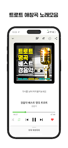노래 검색 기능과 보관함 기능 일부 노래 가사 지원 취침 타이머 눈이 편안한 다크모드 지원 등 편리한 기능들로 구성되어 있으며 트로트 7080 그룹사운드 관광디스코 대학가요제 미스트롯 미스터트롯 현역가왕 등 다양한 장르의 노래가 수록되어 있습니다