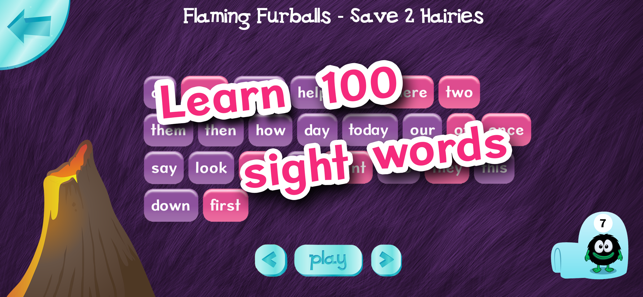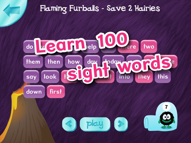 Sight words are words that appear frequently in most of the text we read but can't easily be sounded out. Learn the first 100 high frequency Sight words and introduce Tricky words! Tricky words are phonically irregular words that cannot be sounded out in your head, children need longer to decode these. Knowing these words is essential – they make up half of all written material!• Lower case keys help children to succeed. • See a word, spell it and earn Hairies• The yeti helper reinforces learning.• Each time you spell a word you’ll collect 3 Hairies.• Tricky words give pink Hairies.• When you have enough Hairies play the game! • Tap a Hairy to make it jump to the flag.• Bounce on yeti bellies and escape from dangers.• There are four mountains to climb and 12 levels of Hairy fun.Designed for 5-7 years.This app is strictly educational and has no in-app purchases.********************************************************REVIEWS********************************************************Bri