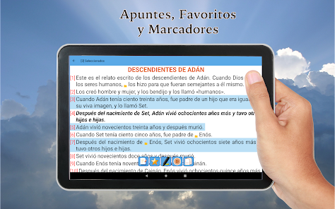 Puede seleccionar uno o varios versculos de un capitulo y marcar como favorito tambien puedes compartir con tus amigos los versculos en las diferentes redes sociales