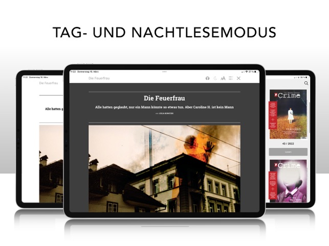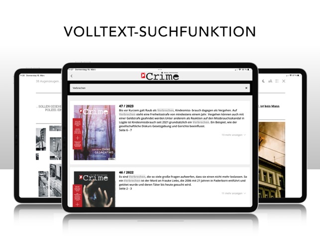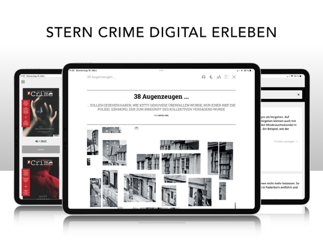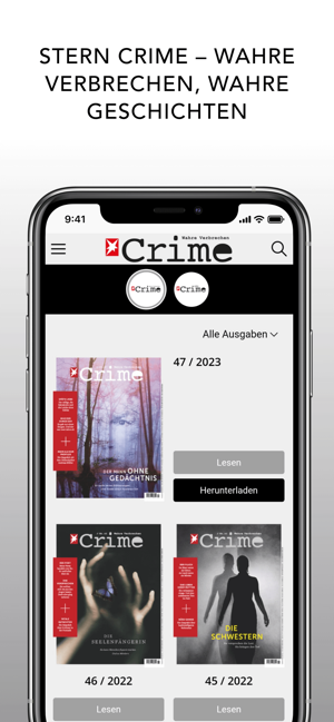 Crime – das True-Crime Magazin vom stern als digitales Magazin auf Ihrem Tablet und Smartphone!Die App bietet folgende Funktionen:• Alle Artikel der gedruckten Crime Ausgabe• Inhaltsverzeichnis mit Direktverlinkung zu den Artikeln• Volltext-Suchfunktion über einzelne/mehrere Ausgaben• Favoritenseiten markierbar (Lesezeichen setzen)• Komfortable Textlesemodus-Darstellung aller Artikel für Tablet und Smartphone• Fünf verschiedene Schriftgrößen• Tag- und Nachtlesemodus• Text-To-Speech (Vorlesefunktion)Ganz egal, ob Sie sich für eine Einzelausgabe oder ein Abonnement entscheiden, mit der Crime-App treffen Sie immer die richtige Wahl. Die Preise:• Einzelausgabe: 4,99 Euro• 2 Monats-Abo: 4,99 Euro• Jahres-Abo: 23,99 EuroDas Digital-Abonnement verlängert sich automatisch um die entsprechende Laufzeit, wenn diese Funktion nicht bis 24 Stunden vor dem Ende der Laufzeit in den Benutzereinstellungen deaktiviert wird. Sollten Sie weitere Fragen, Anregungen, Lob oder Kritik haben, schreiben Sie uns