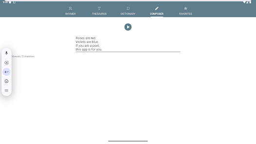 a screen where you can enter your poem text have it read aloud back to you by the device39s texttospeech engine and see the word/character count