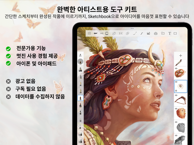 빠른 스케치에서 완성도 높은 아트 워크에 이르기까지 Sketchbook은 여러분의 창의력이 최대한 발휘되도록 지원하겠습니다.Sketchbook은 그림 그리기를 사랑하는 모든 분을 위하여 개발된 빛나는 수상 경력의 스케치, 페인팅 및 드로잉 앱입니다. 많은 아티스트와 일러스트레이터가 전문가 수준의 기능 세트와 고도로 맞춤 가능한 도구를 갖춘 Sketchbook을 애용하고 있습니다. Sketchbook는 우아한 인터페이스와 자연스러운 드로잉 경험, 집중도 높은 사용감으로 창의적인 아이디어를 흐트러짐 없이 포착하고 마음껏 표현할 수 있게 해 주므로 모든 사람의 사랑을 받고 있습니다.• 모든 기능을 갖춘 브러시 유형: 연필 마커, 에어 브러시, 문지르기 기능 등 물리적 대상의 단순한 모양과 질감 이상을 표현• 원하는 모양 그대로 표현 가능하도록 사용자 정의가 가능한 브러시• 필요에 따라 정밀도를 지원하는 가이드와 눈금자 및 스트로크 도구• 완벽한 혼합 모드를 통해 드로잉과 색상을 혼합하고 탐색할 수 있는 유연성을 갖춘 레이어• 깔끔하고 거슬리지 않아 드로잉에 집중할 수 있도록 특별히 제작된 스케치 전용 인터페이스프리미엄 번들을 구매하면 더 많은 기능을 사용할 수 있습니다…• 브러시 가져오기 및 내보내기• 사용자 맞춤형 브러쉬 생성하기• 추가 색상 하모니• 추가 사용자 정의 그레이디언트• 참조 이미지에서 색상 선택하기• 이미지에서 색상 팔레트 추출하기• 색상 팔레트 가져오기 및 내보내기• 레이어 그룹화• 블렌드 모드 레이어 마스킹• PDF로 내보내기
