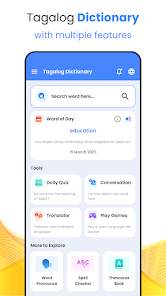 English to Tagalog Dictionary is best advance amp accurate Android Dictionary Application specially designed for Tagalog and Filipino speakers who are keen to learn meanings of English language through Tagalog dictionary The Tagalog Dictionary basically has two modes you can search words or translate from English to Tagalog or Filipino to English that can be switched through Toggle button present on main home screen You can also search any English to Tagalog or Tagalog to English word phrase and even sentence Online with our online Tagalog Language Translate service its simplest user interface is very helpful for users to search any word from English to Tagalog Dictionary or from Tagalog to English Dictionary This Free offline Tagalog Dictionary is also a very helpful English pronunciation and spelling learning tool and it also has one powerful tool to translate sentences from Tagalog to English and English to Tagalog Main Features of English to Tagalog dictionary are as follows Home which allows the users to opt from their desirable language to translate and search its meanings be in English to Tagalog and Tagalog to English Favorite To mark any of the searched word favorite in Filipino to English Dictionary Thesaurus Keeping in mind the ease of user this feature is included in English to Tagalog Dictionary or Tagalog to English Dictionary so that user may select any of the alphabet from the list and words staring from that particular will be displayed in list form PronunciationAudio tool to learn pronunciation of English word along its meanings Tagalog Filipino Keyboard is the Ace feature of Tagalog Dictionary which helps the user to type Tagalog word quite easily when Tagalog to English Dictionary mode is selected Auto word search option This option enlists all the related words as a suggestion which user is looking for ie quick access to words assisting users to search their desirable words in no time English to Tagalog ampTagalog to English Translator This feature is helpful to translate English to Tagalog sentences and Tagalog to English sentence conversion Recent words To keep record of last searched words Quiz of the day Feature to test users learning Download this free offline English Tagalog Dictionary Through this Filipino dictionary you get daily word amp Quiz notification to increase your vocabulary and to test your learning Apart from offline dictionary amp Advance online dictionary this is also a learning tool for Tagalog speakers