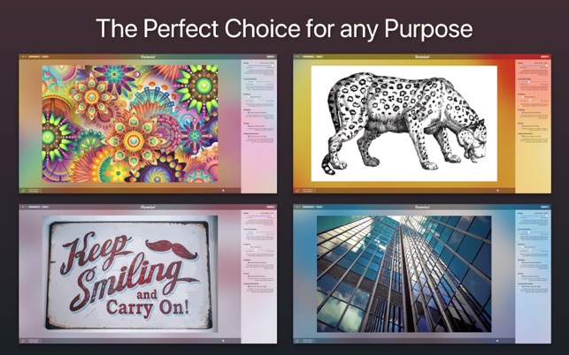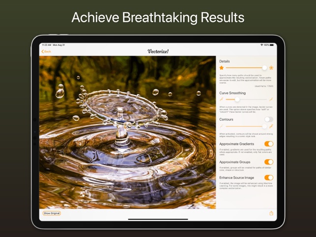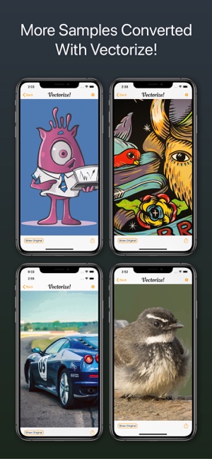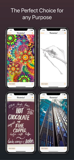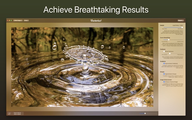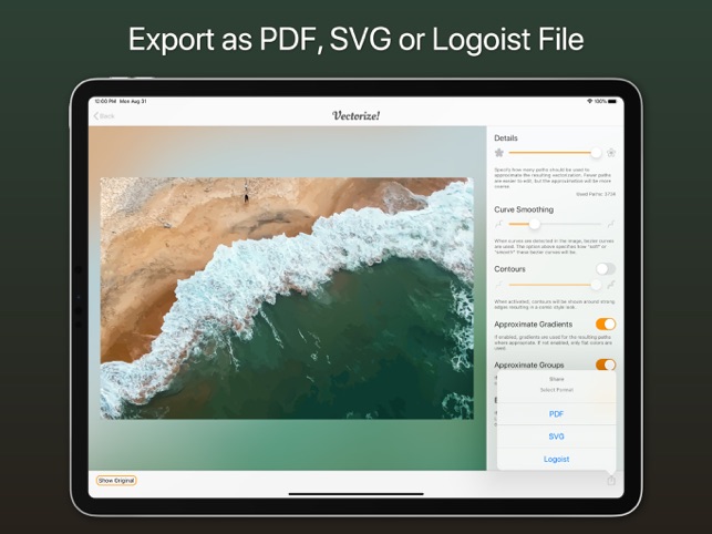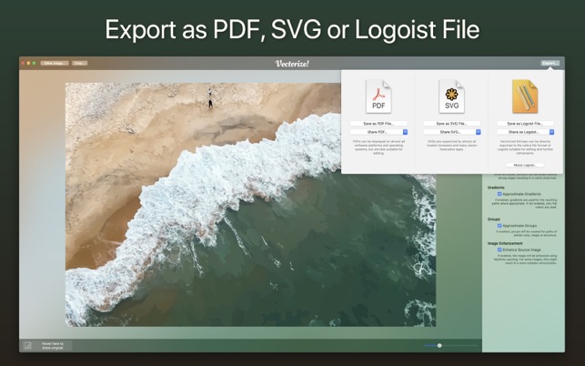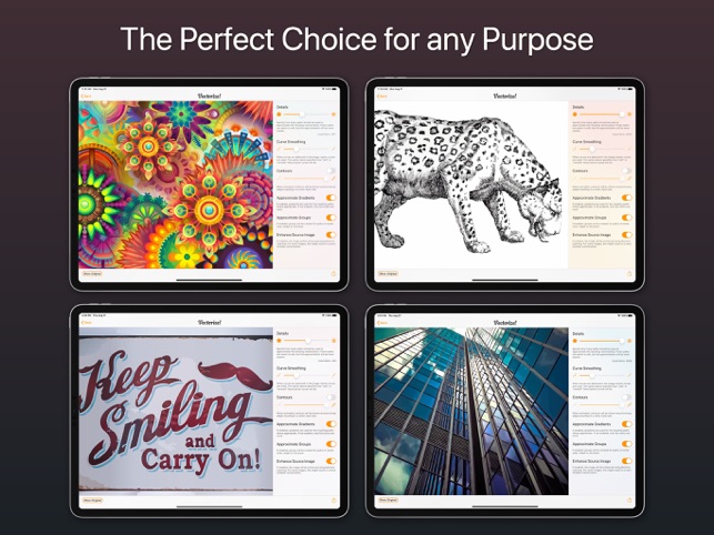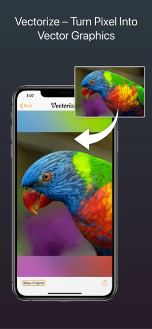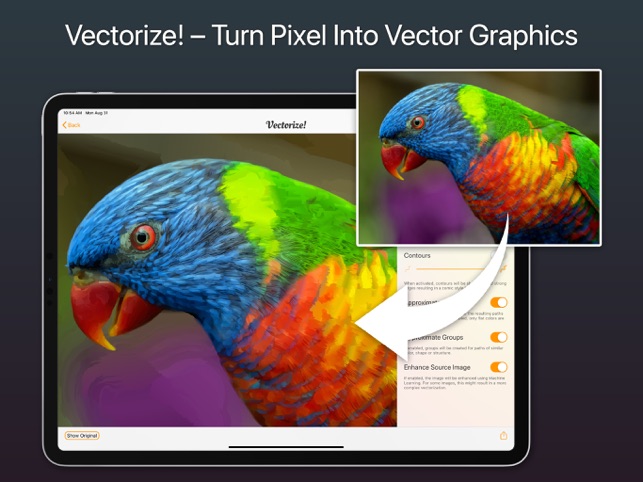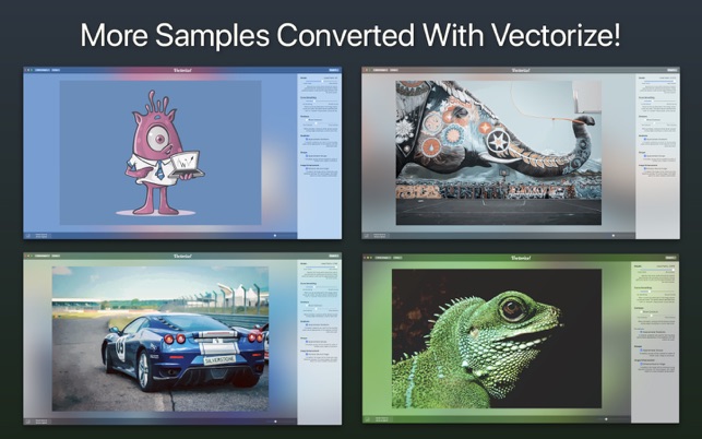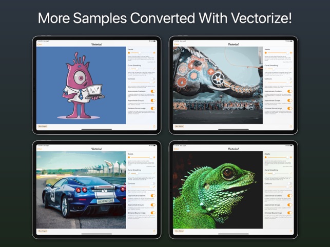 Vectorize! is the perfect tool for quickly and easily converting any pixel graphic into a resolution-independent, scalable vector format – and not just for mac, but also for iPhone and iPad. No matter you’d like to convert, let’s say a low resolution JPG Logo, a comic, sketch, or even a complete photo – Vectorize! will turn your pixels into vectors. The starting material can then be upscaled at will.Import, Convert, ExportConverting a pixel-based-graphic (e.g. a photo, drawing, etc.) into a resolution-independent vector graphic with Vectorize! is quite self-explanatory: First, simply choose a file, or use your iPhone to take a picture – and then let Vectorize! do the rest. Using your iPhone to take a photo to directly import into Vectorize! is another very practical option at your disposal.After your graphic has been selected and imported, you can determine the desired level of detail of your result and if additional contours or edge smoothing should be applied, after which the final p