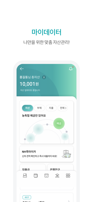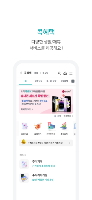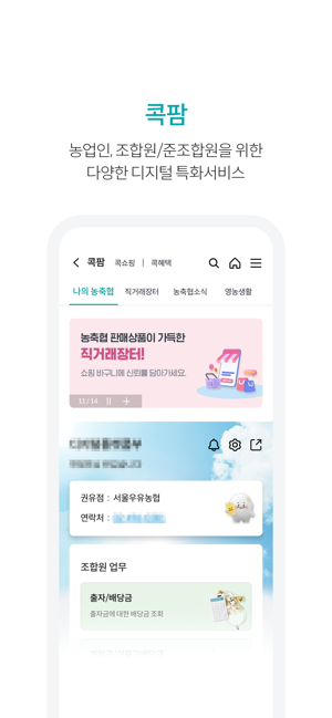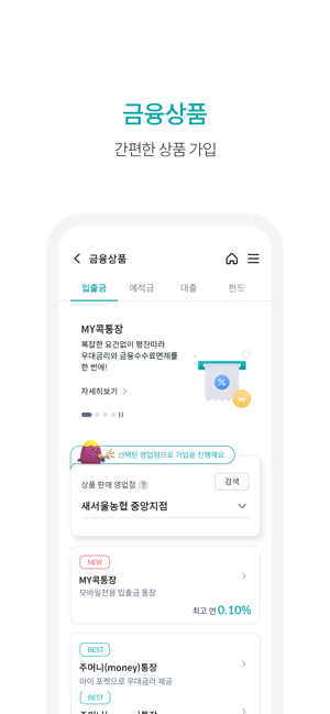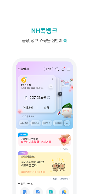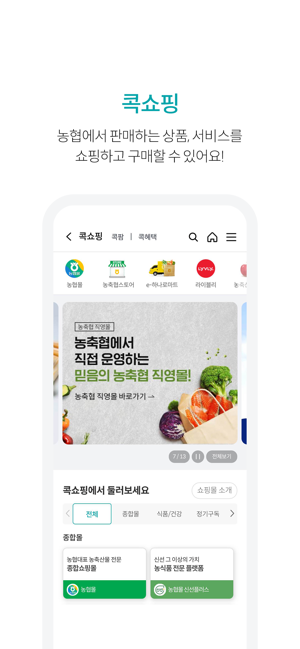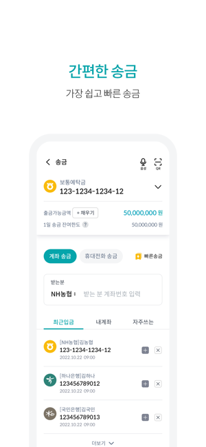 언제 어디서나 내 손에 콕! 내 맘의 콕! [NH콕(Cok)뱅크 브랜드 안내]■ 콕(Cok)은 [(Agricultural) Cooperatives of Korea]의 약자로서 [대한민국 농업협동조합]을 의미■ 콕뱅크는 금융, 정보, 쇼핑을 누구나 쉽고 편리하게 이용할 수 있도록 하는 농협상호금융의 모바일뱅크 서비스 입니다.[NH콕뱅크 주요 서비스]■ 간편한 회원가입 : 복잡한 인증 절차 없이 휴대전화 및 농협계좌 인증만으로 회원가입이 가능합니다.■ 4가지 뱅킹모드를 지원합니다. 1) 일반모드 : 마이데이터, 금융상품, 콕팜, 콕쇼핑, 콕혜택 등 콕뱅크의 전체서비스를 편리하게 접근/이용할 수 있는 콕뱅크의 기본 뱅킹 메인모드 입니다. 2) 조합원모드 : 조합원에게 특화된 맞춤형 모드입니다. 3) 큰글모드 : 시니어, 저시력 고객을 위해 송금, 조회를 큰글씨로 제공하는 서비스 입니다. 4) 내맘콕모드 : 나만의 뱅킹화면으로 디자인 할 수 있는 뱅킹모드 입니다. ■ 송금 : 간편하게 로그인(숫자6자리)하여 계좌비밀번호 입력 없이 간편하게 송금이 가능합니다.1) 간편로그인(숫자6자리) 고객 : 1일 500만원까지 송금 가능2) 콕PASS(모바일OTP) 발급 고객 : 1회 1천만원, 1일 5천만원까지 송금 가능3) OTP(실물) 등록 및 설정 고객 : 1회 1억원, 1일 5억원까지 송금 가능 ※ ※ 콕PASS 와 OTP(실물) 모두 사용 가능■ 빠른 송금 : 출금계좌, 입금계좌, 입금액을 미리 설정하고 빠르게 송금하는 서비스 입니다.■ 조회 : 간편하게 농협계좌 및 다른금융계좌 등록이 가능하며 조회가 가능합니다.■ 오픈뱅킹 : 전 금융기관 고객계좌를 등록한 후 조회·이체가 가능합니다.■ 모바일현금카드 : 현금이나 카드 없이 휴대전화로 전국 하나로마트에서 결제가 가능합니다.(일한도 50만원)■ 제로페이 : 소상공인을 위한 간편결제 서비스로 QR코드 인식 및 QR/바코드 제시를 통해 결제가 이루어지는 계좌기반의 직불결제 서비스입니다.(일한도 200만원)■ 제로페이