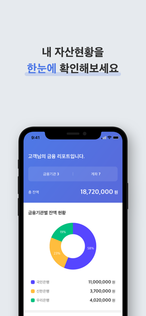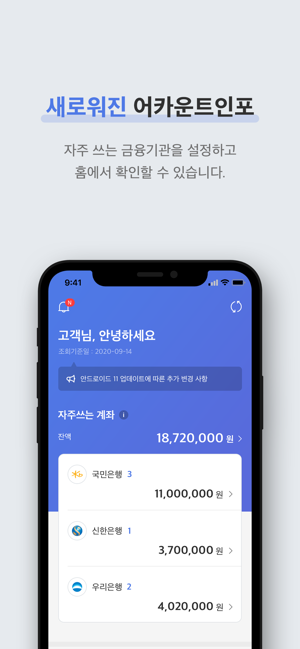 나의금융정보를 한눈에!!계좌정보통합관리서비스란?내가 보유한 금융정보를 한눈에 조회하고 관리할 수 있는 서비스입니다. ■ 서비스소개[내계좌 한눈에]- 본인이 거래하는 금융기관의 계좌를 한눈에 조회하고 1년 이상거래가 없는 소액비활동성 계좌*를 잔고이전 · 해지 할수 있습니다.*1년 이상 미사용 및 잔고 50만원 이하의 계좌[내카드 한눈에]- 본인의 카드정보, 결제 예정금액, 최근이용대금 및 포인트 정보를 조회할 수 있습니다.[내자동이체 한눈에]- 여러 금융회사에 등록되어 있는 본인의 자동이체 등록정보를 일괄조회하고 자동이체를 변경하거나 해지할 수 있습니다.- 그 외 보험가입내역, 대출정보, 금융거래정보제공사실 통보내역 등 다양한 금융정보 조회가 가능합니다.■ 이용안내[이용방법]- 서비스 이용을 위해서는 “이용등록"이 필요합니다.- 이용등록 시 휴대폰인증을 통한 단말기 점유 및 공인인증서 또는 바이오정보를 통한 본인여부를 확인합니다.- 내카드 한눈에 및 보험, 대출 조회등 일부 서비스는 별도의 위임절차가 필요합니다.[대상고객]- 만 19세 이상 개인만 이용할 수 있습니다. *법인, 외국인 해외체류자 및 미성년자는 서비스 이용 불가 ■ 유의사항- 1인당 1개의 모바일기기에서만 서비스를 이용하실 수 있습니다. ■ 고객센터 안내- 평일 09:00~ 17:00(1577-5500)■ 어카운트인포 앱이용을 위한 접근권한 및 이용목적 안내[선택적 접근권한] - 알림 :PUSH 알림 - Face ID : 얼굴인증 - 위치 : 사용자 위치 *선택적접근권한은 동의하지 않아도 서비스를 이용하실 수 있습니다. - 개발사 이메일 :kftc.appstore@gmail.com