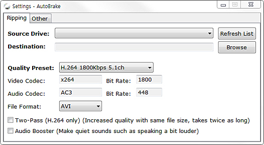 DVD 삽입 전에 Settings 메뉴에서 소스 드라이브와 결과물이 저장될 폴더를 지정할 수 있습니다