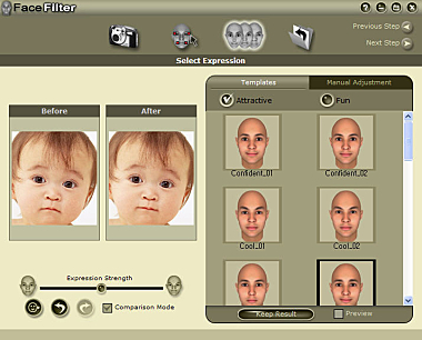 얼굴형, 눈썹, 눈, 입 등의 모양을 단계별로 사용자가 직접 변형시키고 갖가지 얼굴 표정 샘플을 적용시키는 등 얼굴 모양을 바꿔주는 프로그램입니다.