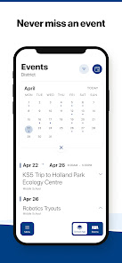 The event section shows a list of events throughout the district Users can add an event to their calendar to share the event with friends and family with one tap