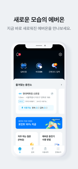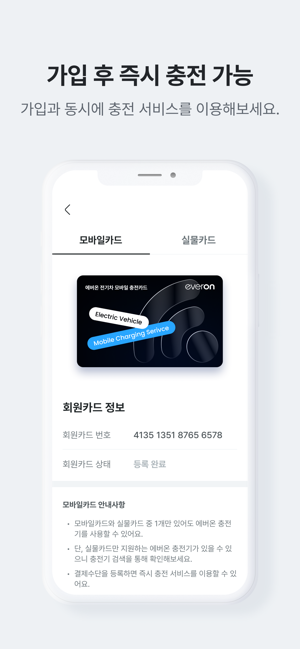 [에버온 전기차 충전서비스]① 충전소 확인은 더 빠르게!- 전국의 에버온/로밍 충전소 상태 확인- 전기차 충전소 위치 제공 및 경로 탐색- 즐겨찾는 충전소는 대쉬보드 등록② 충전기 사용은 더 편리하게!- 회원가입 후 즉시 충전기 사용- 실물카드가 없어도 간편인증(스마트QR, 간편코드, 바로ON) 적용- 실시간 전기차 충전 상태 확인 및 충전 이력 관리③ 비용은 더 저렴하게!- 내 상황에 맞춰 선택할 수 있도록 결제수단 확대- 심야에 더 저렴하게 충전할 수 있도록 계시별 요금제 적용④ 안내와 답변은 더 정확하게!- 충전기 모델별 사용법 제공- 전기차 충전기 고장 신고/고객 문의에 대한 처리 현황 및 답변 확인